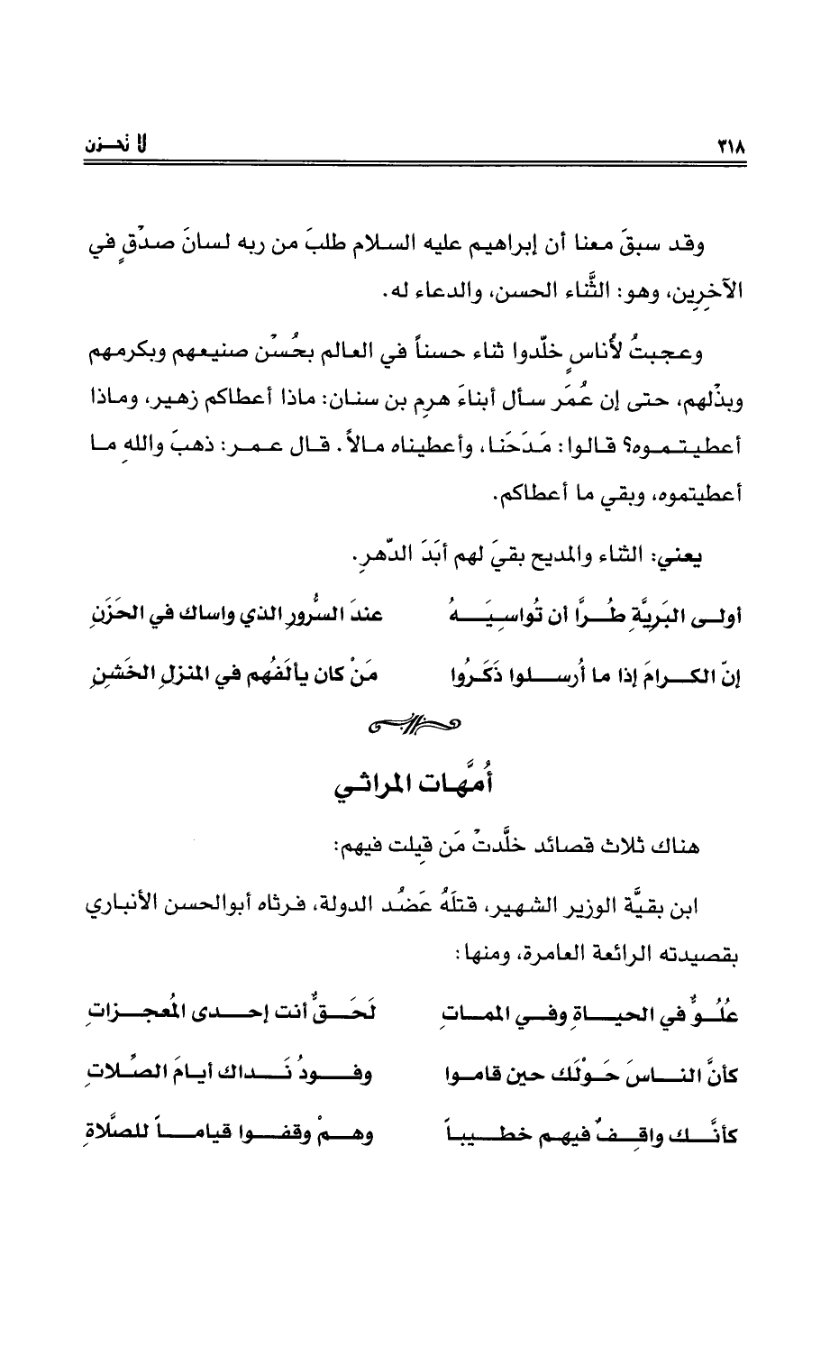وعجبْتُ لأُناسٍ خلَّدوا ثناءً حسناً في العالمِ بحُسْنِ صنيعهِم وبكرمهِم وبذْلِهم، حتى إنَّ عُمَرَ سأل أبناء هرِم بنِ سنانٍ: ماذا أعطاكمْ زهيرٌ، وماذا أعطيتُموهُ؟ قالوا: مَدَحَنا، وأعطيناهُ مالاً. قال عمرُ: ذهب واللهِ ما أعطيتموهُ، وبقي ما أعطاكمْ.