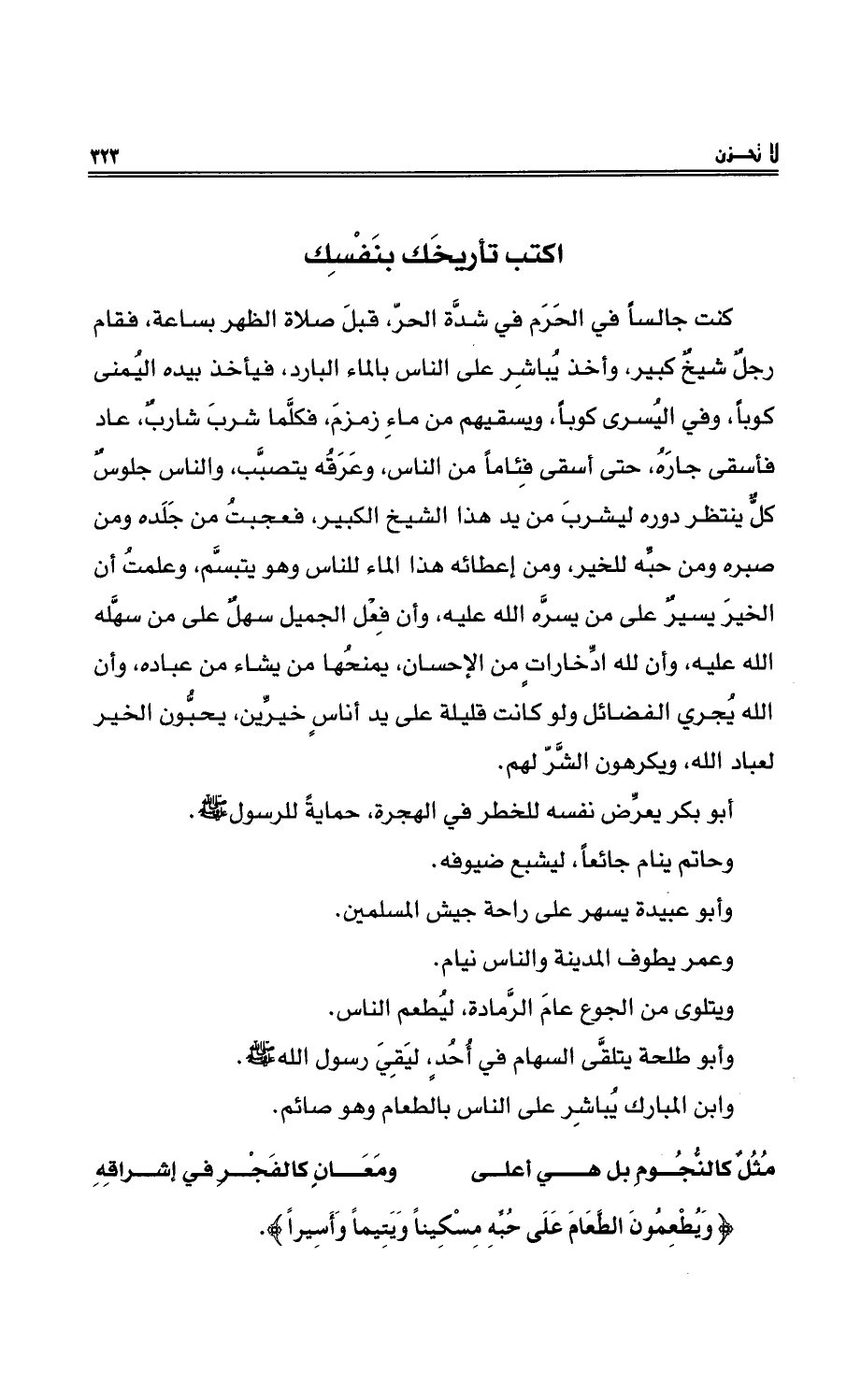 كنتُ جالساً في الحرَمِ في شدَّةِ الحرّ، قبل صلاةِ الظهرِ بساعةٍ، فقام رجلٌ شيخٌ كبيرٌ، وأخذ يُباشِرُ على الناسِ بالماءِ الباردِ، فيأخذُ بيدهِ اليُمنى كوباً، وفي اليُسرى كوباً، ويسقيهمُ منْ ماءِ زمزم، فكلَّما شرب شاربٌ، عاد فأسقى جارهُ، حتى أسقى فِئاماً من الناسِ، وعَرَقُه يتصبَّبُ، والناسُ جلوسٌ كلٌّ ينتظرُ دوره ليشرب منْ يدِ هذه الشيخِ الكبيرِ، فعجبتُ منْ جلدِهِ ومنْ صبرِهِ ومنْ حبِّه للخيرِ، ومن إعطائِه هذا الماءَ للناسِ وهو يتبسَّمُ، وعلمتُ أنَّ الخير يسيرٌ على منْ يسرَّه اللهُ عليه، وأنَّ فِعْلَ الجميِل سَهْلٌ على منْ سهَّلهُ اللهُ عليه، وأنَّ للهِ ادِّخاراتٍ من الإحسانِ، يمنحُها منْ يشاءُ منْ عبادهِ، وأنَّ اللهُ يُجري الفضائل ولو كانتْ قليلةً على يدِ أناسٍ خيرِّين، يحبُّون الخيْر لعبادِ اللهِ، ويكرهون الشَّرَّ لهم.