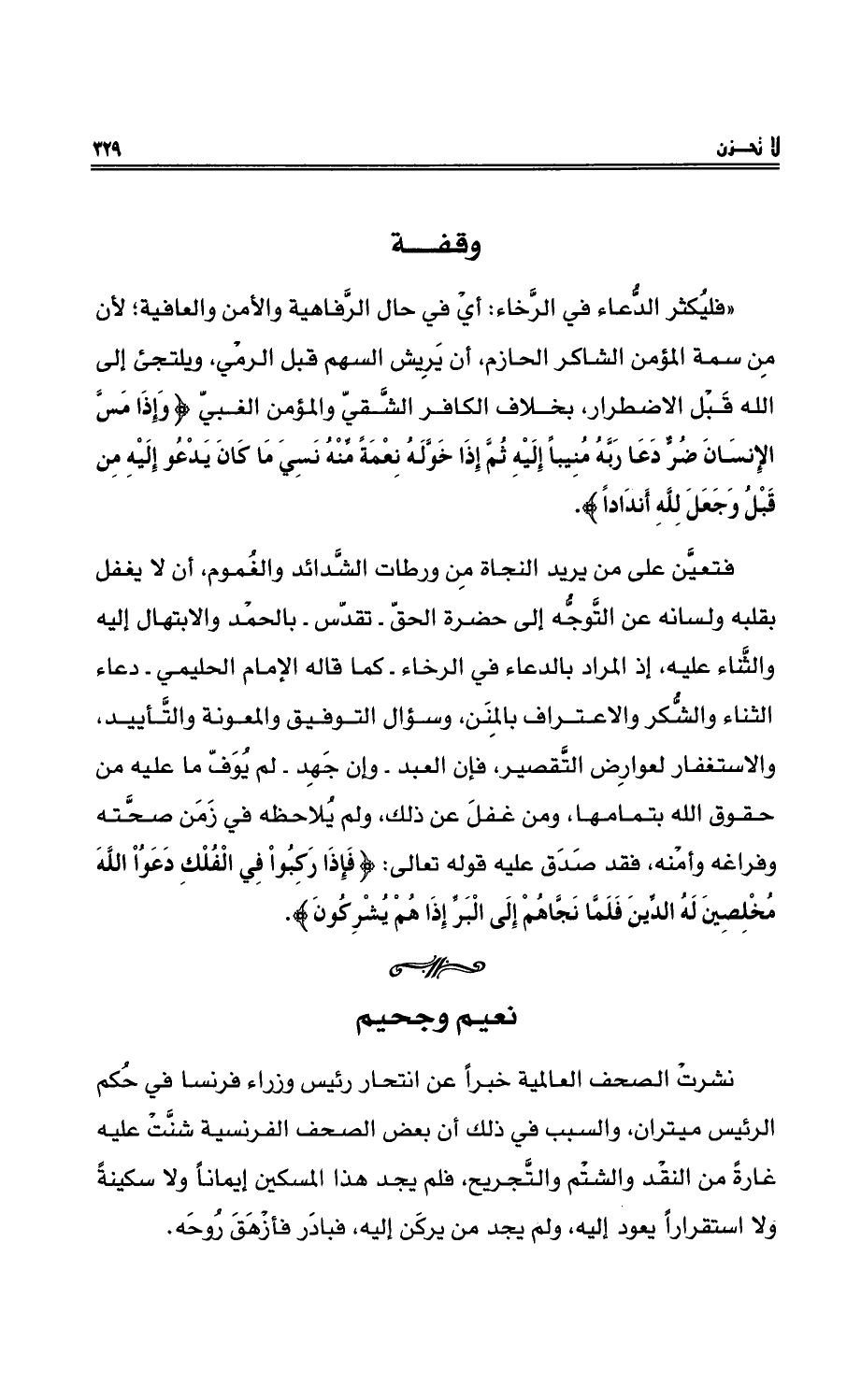 فتعيَّن على منْ يريدُ النجاةَ مِنْ ورطاتِ الشَّدائدِ والغُمومِ، أنْ لا يفعل بقلبهِِ ولسانِه عنِ التَّوجُّهِ إلى حضرةِ الحقِّ - تقدّسَ - بالحمْدِ والابتهالِ إليه والثَّناء عليه، إذ المراد بالدعاء في الرخاء - كما قاله الإمام الحليمي - دعاء الثناءِ والشُّكرِ والاعترافِ بالمِنن، وسؤالِ التوفيقِ والمعونةِ والتَّأييدِ. والاستغفارِ لعوارضِ التَّقصيرِ، فإنَّ العبد - وإنْ جهِد - لم يُوفِّ ما عليهِ منْ حقوقِ الله بتمامِها، ومنْ غفل عنْ ذلك، ولم يُلاحظْه في زَمَنِ صِحَّتِهِ وفراغِه وأمْنِهِ، فقدْ صدقَ عليه قولُه تعالى: {فَإِذَا رَكِبُوا فِي الْفُلْكِ دَعَوُا اللَّهَ مُخْلِصِينَ لَهُ الدِّينَ فَلَمَّا نَجَّاهُمْ إِلَى الْبَرِّ إِذَا هُمْ يُشْرِكُونَ} » .