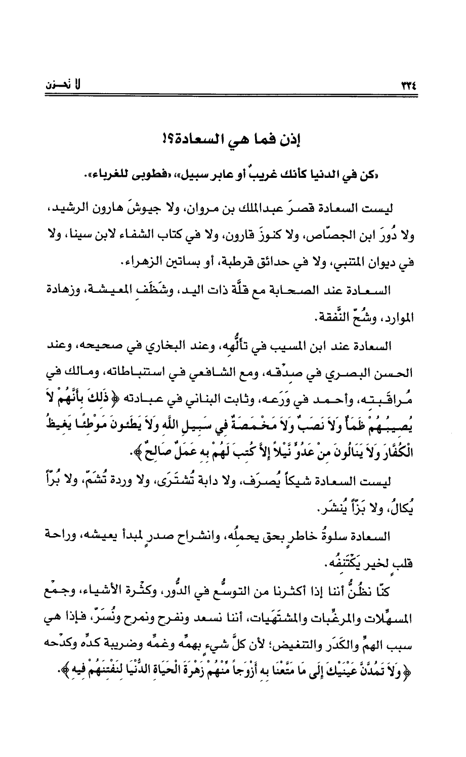 ليسِ السعادةُ قصر عبدِالملك بنِ مروان، ولا جيوش هارونِ الرشيدِ ولا دُور ابنِ الجصَّاصِ، ولا كنوز قارون، ولا في كتابِ الشفاءِ لابنِ سينا، ولا في ديوانِ المتنبي، ولا في حدائقِ قرطبة، أو بساتينِ الزهراءِ.