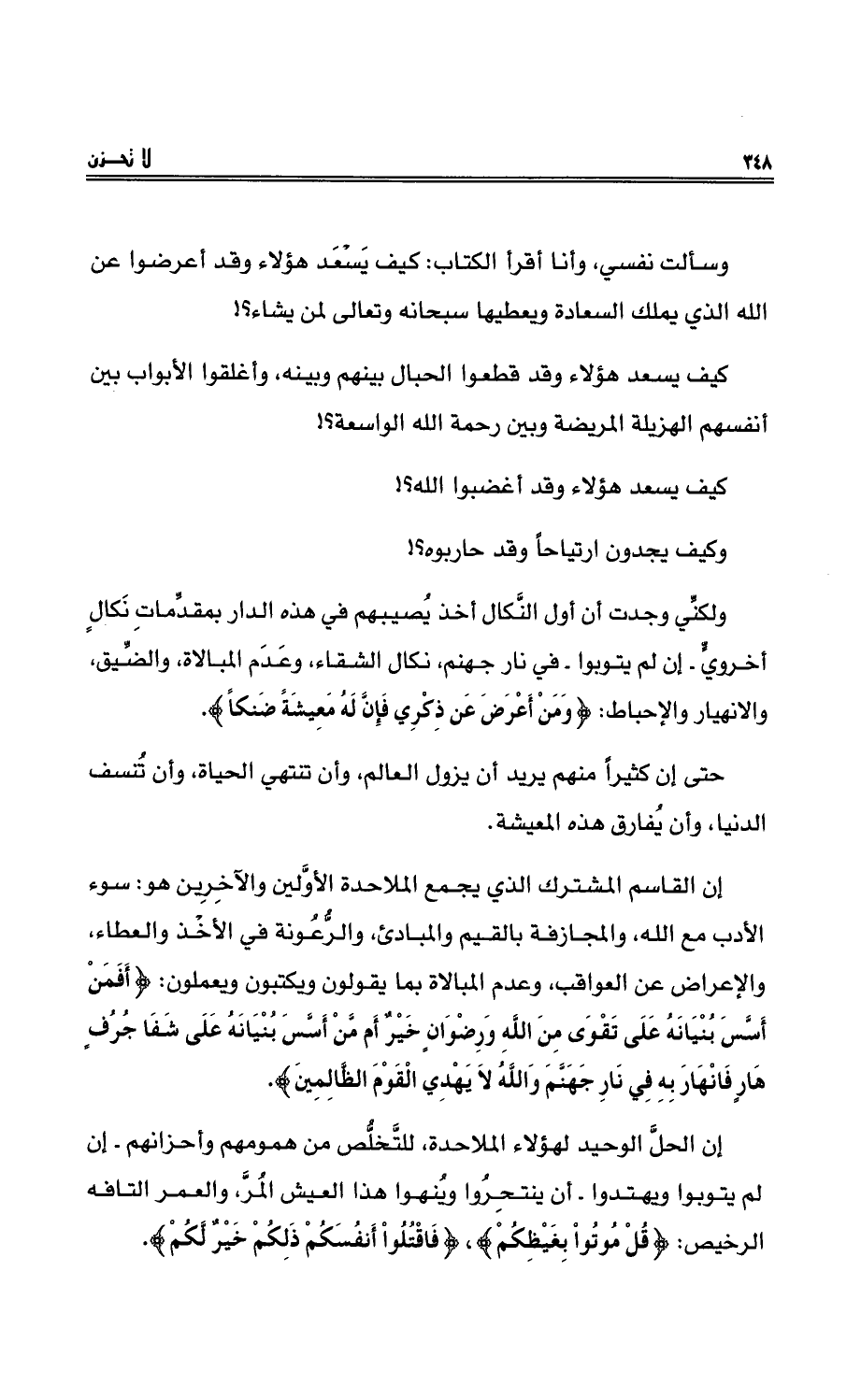 وسألتُ نفسي، وأنا أقرأُ الكتاب: كيف يَسْعَدُ هؤلاءِ وقدْ أعرضُوا عنِ اللهِ الذي يملكُ السعادة ويعطيها سبحانه وتعالى لمنْ يشاءُ؟!