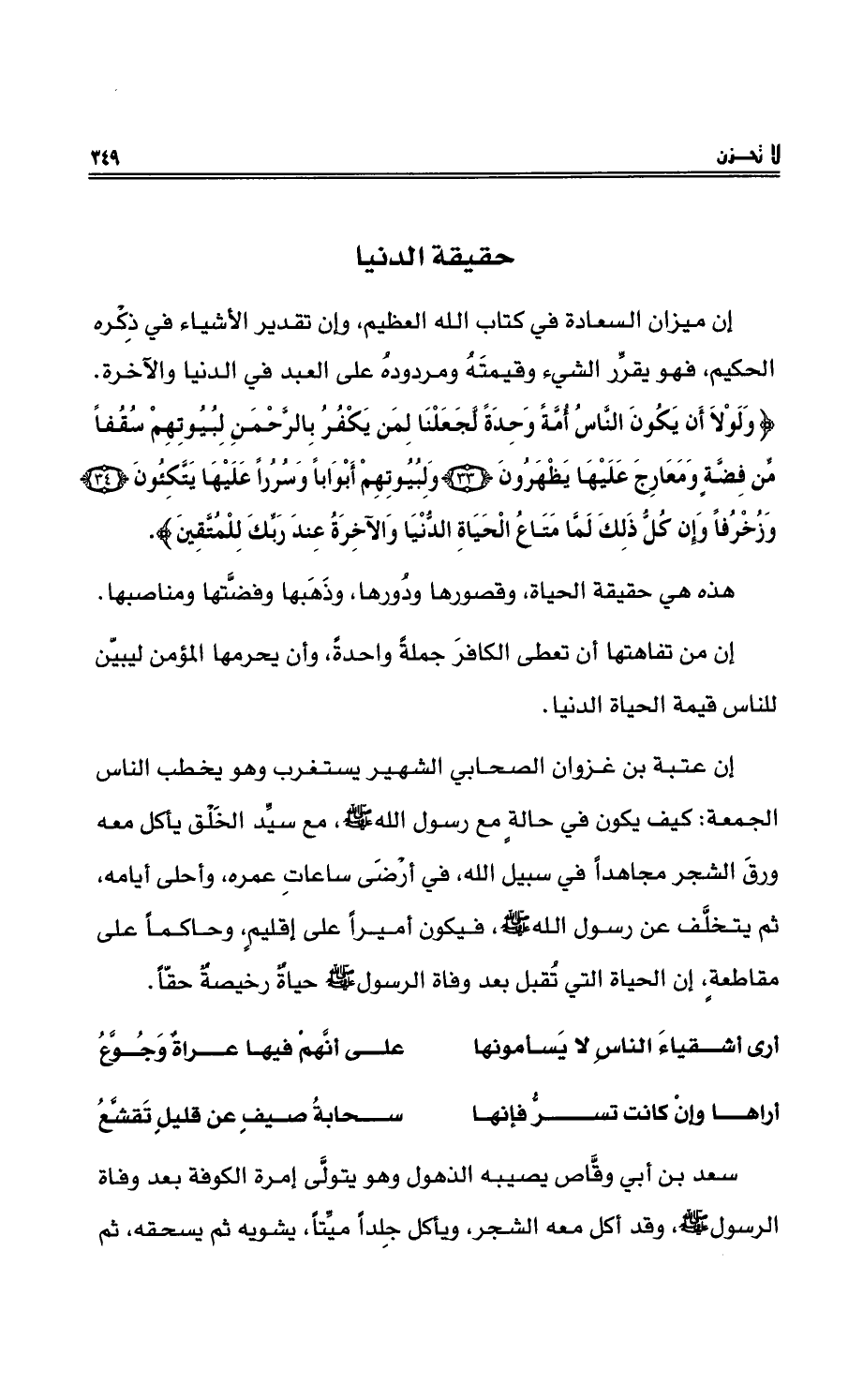 إنَّ ميزان السعادةِ في كتابِ اللهِ العظيمِ، وإنَّ تقدير الأشياءِ في ذِكْرِهِ الحكيم، فهو يقرِّرُ الشيء وقيمتهُ ومردودَهُ على العبدِ في الدُّنيا والآخرةِ {وَلَوْلَا أَن يَكُونَ النَّاسُ أُمَّةً وَاحِدَةً لَجَعَلْنَا لِمَن يَكْفُرُ بِالرَّحْمَنِ لِبُيُوتِهِمْ سُقُفاً مِّن فَضَّةٍ وَمَعَارِجَ عَلَيْهَا يَظْهَرُونَ {33} وَلِبُيُوتِهِمْ أَبْوَاباً وَسُرُراً عَلَيْهَا يَتَّكِؤُونَ {34} وَزُخْرُفاً وَإِن كُلُّ ذَلِكَ لَمَّا مَتَاعُ الْحَيَاةِ الدُّنْيَا وَالْآخِرَةُ عِندَ رَبِّكَ لِلْمُتَّقِينَ} .