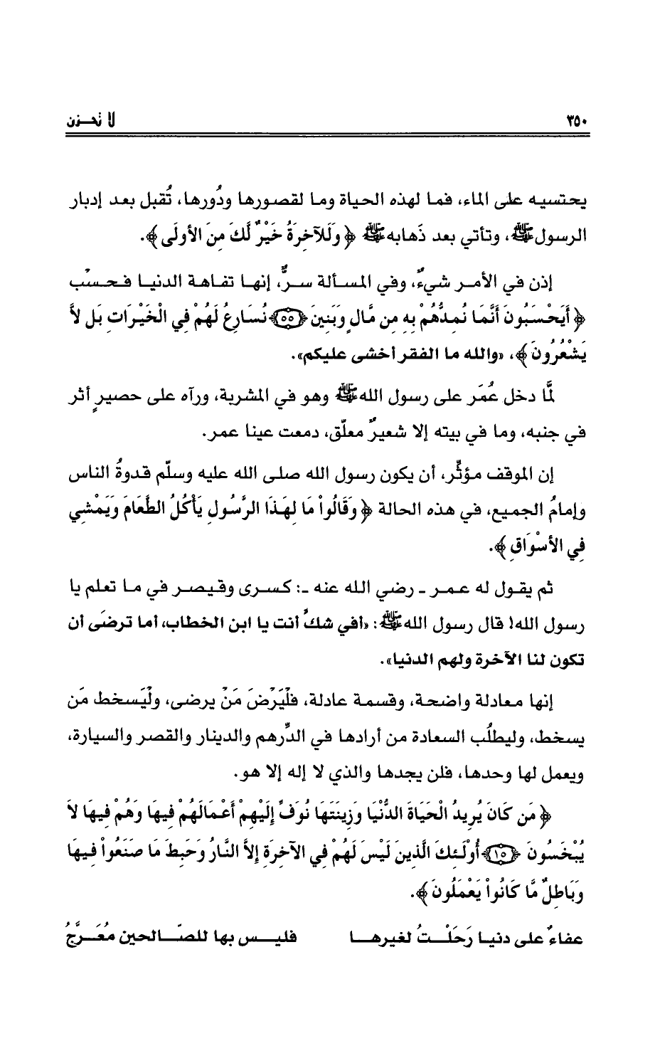 يحتسيهِ على الماءِ، فما لهذهِ الحياةِ وما لقصورِها ودُورِها، تُقبلُ بعد إدبارِ الرسولِ - صلى الله عليه وسلم -، وتأتي بعد ذهابهِ - صلى الله عليه وسلم - {وَلَلْآخِرَةُ خَيْرٌ لَّكَ مِنَ الْأُولَى} .