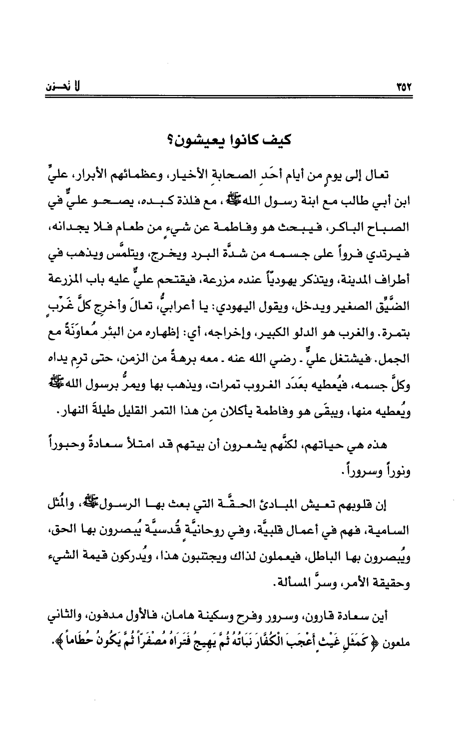 تعال إلى يومٍ منْ أيام أحدِ الصحابةِ الأخبارِ، وعظمائِهم الأبرارِ، عليِّ بن أبي طالبٍ مع ابنهِ رسولِ اللهِ - صلى الله عليه وسلم -، مع فلذةِ كبدِهِ، بصحُو عليٌّ في الصباحِ الباكرِ، فيبحثُ هو وفاطمةُ عن شيءٍ منْ طعامٍ فلا يجدانِ، فيرتدي فرواً على جسمِهِ منْ شدَّةِ البردِ ويخرجُ، ويتلمَّسُ ويذهبُ في أطرافِ المدينةِ، ويتذكرُ يهوديّاً عنده مزرعةٌ، فيقتحمُ عليٌّ عليه باب المزرعةِ الضَّيِّقِ الصغيرِ ويدخلُ، ويقولُ اليهوديُّ: يا أعرابيُّ، تعالى وأخرِج كلَّ غَرْبٍ بتمرةٍ. والغربُ هو الدلوُ الكبيرُ، وإخراجُه، أيْ: إظهارُه من البئرِ مُعاوَنَةً مع الجملِ. فيشتغلُ عليٌّ - رضي اللهُ عنهُ - معهُ برهةً من الزمنِ، حتى ترِم يداه ويكلُّ جسمُه، فيُعطيهِ بعددِ الغروبِ تمراتٍ، ويذهبُ بها ويمرُّ برسولِ اللهِ - صلى الله عليه وسلم - ويُعطيه منها، ويبقى هو وفاطمةُ يأكلان مِنْ هذا التمرِ القليلِ طيلة النهارِ.