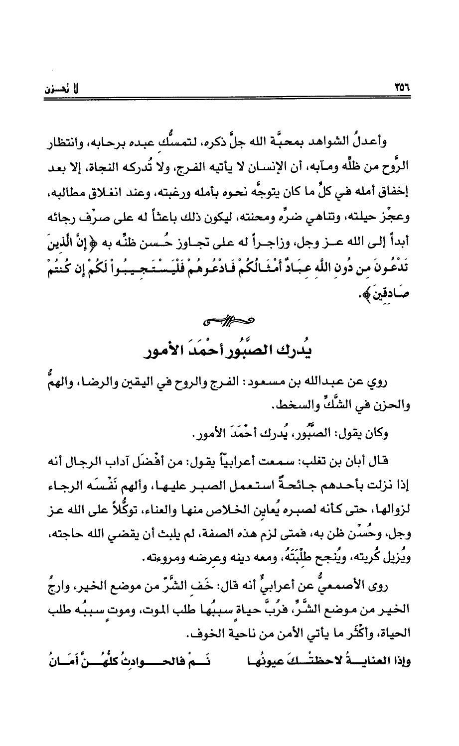 قال أبانُ بنُ تغلب: سمعتُ أعربيّاً يقولُ: منْ أفْضلِ آداب الرجالِ أنهُ إذا نزلتْ بأحدِهمْ جائحةٌ استعمل الصبر عليها، وألهم نفْسه الرجاء لزوالِها، حتى كأنه لصبرِه يعاينُ الخلاص منها والعناء، توكُّلاً على اللهِ عزَّ وجلَّ، وحُسْنِ ظنٍّ به، فمتى لزِم هذه الصفة، لم يلبثْ أن يقضي اللهُ حاجته، ويُزيل كُربيه، ويُنجح طِلْبتهُ، ومعهُ دينُه وعِرضُه ومروءتُه.