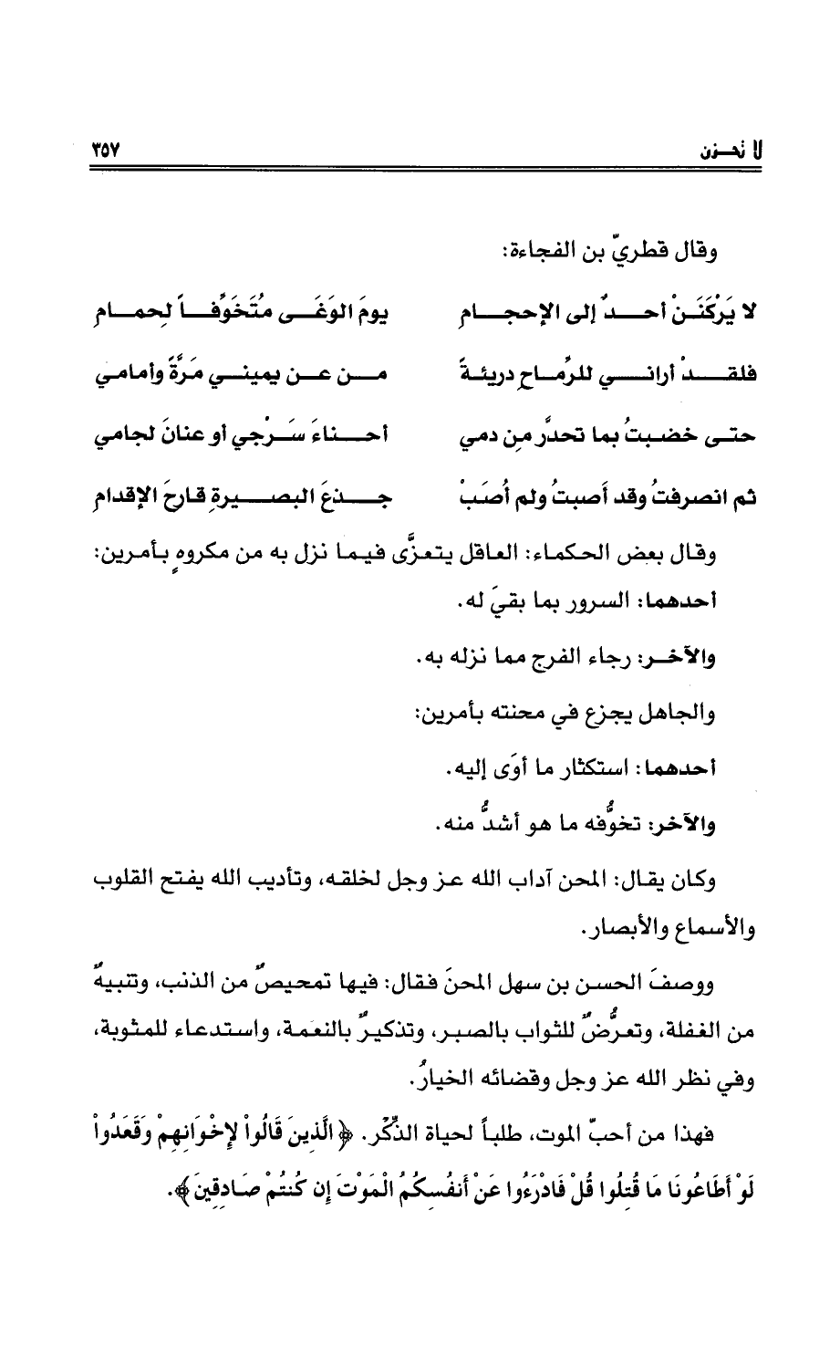 فهذا من أحبَّ الموت، طلباً لحياةِ الذِّكْرِ. {الَّذِينَ قَالُواْ لإِخْوَانِهِمْ وَقَعَدُواْ لَوْ أَطَاعُونَا مَا قُتِلُوا قُلْ فَادْرَؤُوا عَنْ أَنفُسِكُمُ الْمَوْتَ إِن كُنتُمْ صَادِقِينَ} .