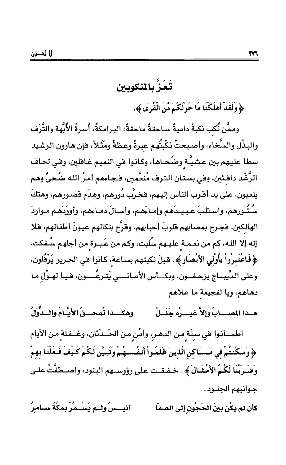 وممَّنْ نُكِب نكبةً داميةً ساحقةً ماحقةً: البرامكةُ، أُسرةُ الأُسرةُ الأُبَّهةِ والتَّرَفِ والبذْلِ والسَّخاءِ، وأصبحتْ نكْبتُهم عِبرةً وعظةً ومثلاً، فإنَّ هارون الرشيد سطا عليهمْ بيْن عشيَّةٍ وضُحاها، وكانوا في النعيمِ غافلين، وفي لحافِ الرَّغدِ دافِئين، وفي بستانِ الترفِ مُنعَّين، فجاءهم أمرُ اللهِ ضُحىً وهم يلعبون، على يدِ أقربِ الناسِ إليهم، فخرَّب دُورهم، وهدمَ قصورهُم، وهتك سُتُورهُم، واستلب عبيدهُمْ، وأسال دماءهم، وأوردهم موارد الهالِكين، فَجَرَحَ بمصابِهم قلوب أحبابِهم، وقرَّح بنكالِهم عيون أطفالِهم، فلا إله إلا اللهُ، كم منْ نعمةٍ عليهم سُلبتْ، وكمْ منْ عبرةٍ منْ أجلهِم سُفكتْ، {فَاعْتَبِرُوا يَا أُولِي الْأَبْصَارِ} . قبل نكبتهم بساعةٍ، كانوا في الحرير يرْفُلون، وعلى الدِّيباجِ يزحفون، وبكأسِ الأماني يترعُون، فيها لهوْلِ ما دهاهُم، ويا لفجيعةِ ما علاهم