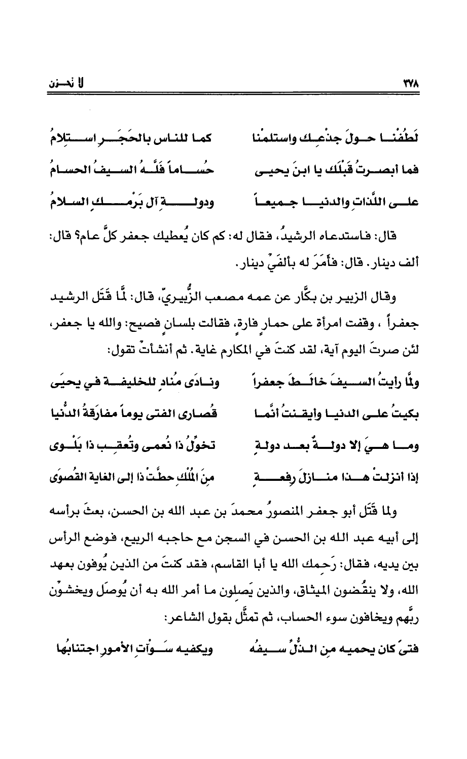 ولما قَتَلَ أبو جعفر المنصورُ محمد بن عبدِاللهِ بن الحَسَنِ، بعث برأسِهِ إلى أبيهِ عبدِاللهِ بن الحسنِ في السجنِ مع حاجبِهِ الربيعِ، فوضعَ الرأسَ بين يديهِ، فقال: رحمك اللهُ يا أبا القاسم، فقدْ كنت من الذين يُفون بعهدِ اللهِ، ولا ينقُضون الميثاق، والذين يصِلون ما أمر اللهُ بهِ أنْ يُوصل ويخشوْن ربَّهم ويخافون سوء الحسابِ، ثم تمثَّل بقولِ الشاعرِ: