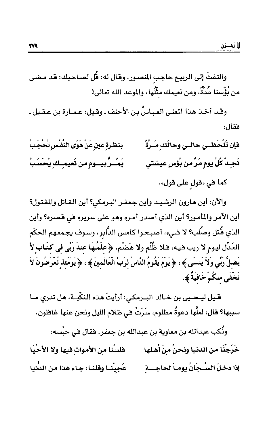والآن: أين هارون الرشيدُ وأين جعفرُ البرمكيُّ؟ أين القاتلُ والمقتولُ؟ أين الآمرُ والمأمورُ؟ أين الذين أصدر أمره وهو على سريرهِ في قصرهِ؟ وأين الذي قتِل وصُلِب؟ لا شيء، أصبحوا كأمسِ الدَّابر، وسوف يجمعُهم الحكمُ العدْلُ ليومِ لا ريب فيه، فلا ظُلْم ولا هضْم، {قَالَ عِلْمُهَا عِندَ رَبِّي فِي كِتَابٍ لَّا يَضِلُّ رَبِّي وَلَا يَنسَى} ، {يَوْمَ يَقُومُ النَّاسُ لِرَبِّ الْعَالَمِينَ} ، {يَوْمَئِذٍ تُعْرَضُونَ لَا تَخْفَى مِنكُمْ خَافِيَةٌ} .