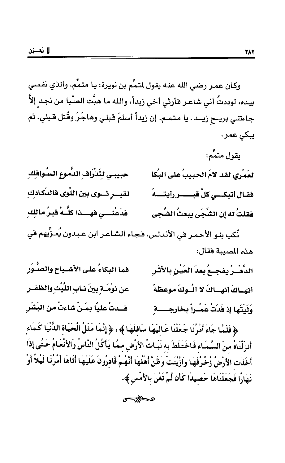 وكان عمرُ رضي اللهُ عنهُ يقولُ لمتمِّمِ بن نويرة: يا متمِّم، والذي نفسي بيده، لَوَدِدْتُ أني شاعرٌ فأرثي أخي زيداً، واللهِ ما هبَّتِ الصّبا منْ نجد إلاَّ جاءتني بريحِ زيدٍ. يا متممُ، إنَّ زيداً أسلم قبلي وهاجرَ وقتل قبلي، ثمَّ يبكي عمر. يقول متمِّم: