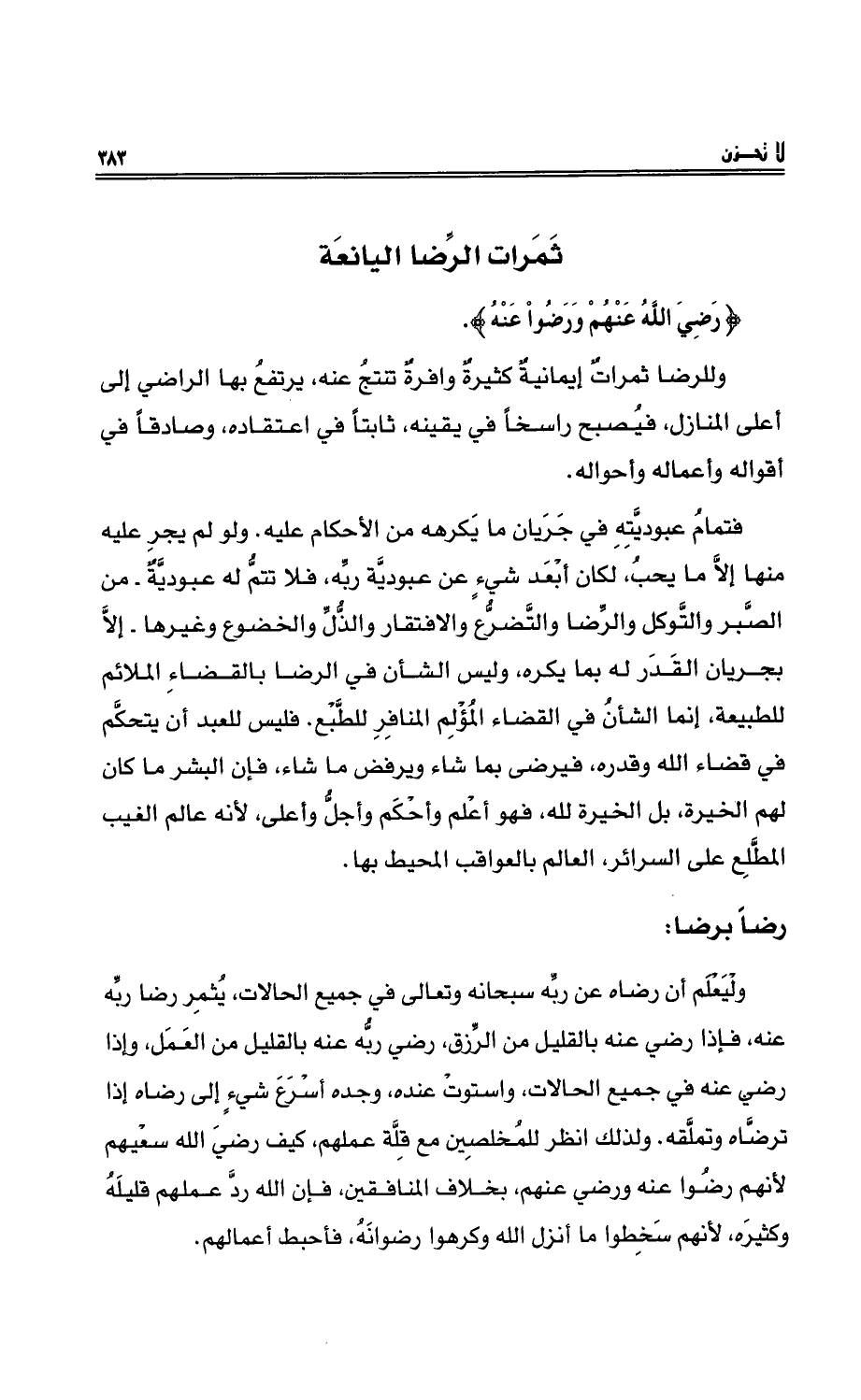 ولْيَعْلم أنَّ رضاه عن ربِّه سبحانهُ وتعالى في جميعِ الحالاتِ، يُثمِرُ رضا ربُه عنه، فإذا رضي عنه بالقليلِ من الرِّزقِ، رضي ربُّه عنه بالقليلِ من العملِ، وإذا رضي عنه في جميع الحالاتِ، واستوتْ عندهُ، وجدهُ أسْرَعَ شيءٍ إلى رضاهُ إذا ترضَّاه وتملَّقه؛ ولذلك انظرْ للمُخلصيِن مع قِلَّةِ عملهِم، كيف رضي اللهُ سعيهم لأنهمْ رضُوا عنهُ ورضي عنهمْ، بخلافِ المنافقين، فإنَّ الله ردَّ عملهم قليلهُ وكثيرهُ؛ لأنهمِ سخِطُوا ما أنزلَ الله وكرهُوا رضوانهُ، فأحبط أعمالهم.