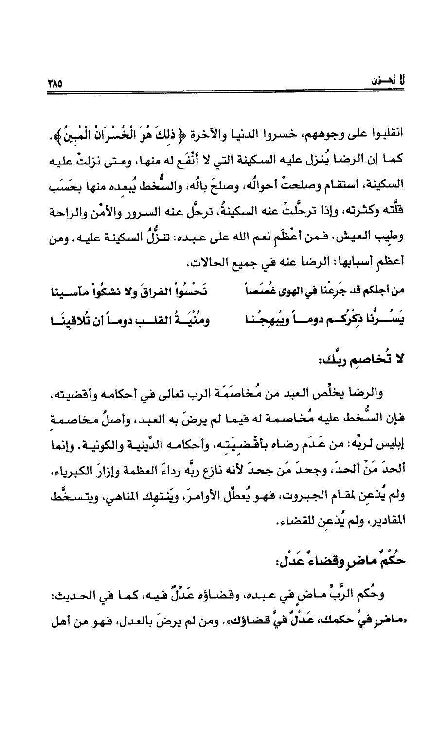 وحُكمُ الرَّبِّ ماضٍ في عبدِه، وقضاؤُه عدْلٌ فيه، كما في الحديثِ: ((ماضٍ فيَّ حكمُك، عَدْلٌ في قضاؤك)) . ومنْ لم يرض بالعدلِ، فهو منْ أهلِ
