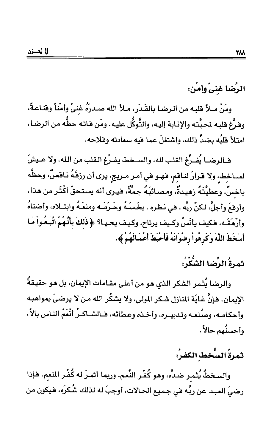 فالرِّضا يُفرِّغُ القلب للهِ، والسخطُ يفرِّغُ القلب من اللهِ، ولا عيش لساخِطٍ، ولا قرار لناقِمٍ، فهو في أمر مريجٍ، يرى أنَّ رزقهُ ناقصٌ، وحظَّهُ باخِسٌ، وعطيَّتهُ زهيدةٌ، ومصائبهُ جمَّةٌ، فيرى أنه يستحقّ أكْثر منْ هذا، وأرفع وأجلَّ، لكنّ ربَّه - في نظرِهِ - بخسهُ وحَرَمَه ومنعَهُ وابتلاه، وأضناهُ وأرهَقَه، فكيف يأنسُ وكيف يرتاح، وكيف يحيا؟ {ذَلِكَ بِأَنَّهُمُ اتَّبَعُوا مَا أَسْخَطَ اللَّهَ وَكَرِهُوا رِضْوَانَهُ فَأَحْبَطَ أَعْمَالَهُمْ} .