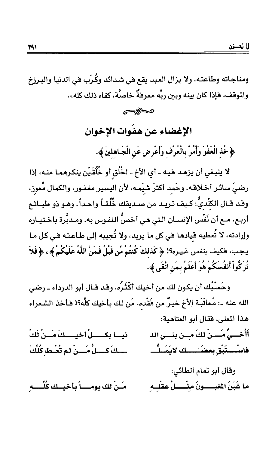وحسْبُك أنْ يكون لك منْ أخيك أكثرُه، وقدْ قال أبو الدرداءِ - رضي الله عنه -: مُعاتبَةُ الأخِ خَيْرٌ منْ فقْدِه، منْ لك بأخيك كلِّه؟! فأخذ الشعراءُ هذا المعنى، فقال أبو العتاهية: