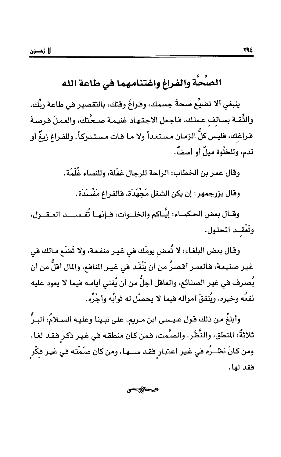 ينبغي ألا تضيِّع صِحَّة جسمِك، وفراغ وقتِك، بالتقصيرِ في طاعةِ ربِّك، والثِّقةِ بسالفِ عمِلك، فاجعلْ الاجتهاد غنيمة صحَّتِك، والعمل فرصة فراغِك، فليس كلُّ الزمانِ مستعداً ولا ما فات مستدركاً، وللفراغِ زيْغٌ أو ندمٌ، وللخْلوةِ مَيْلٌ أو أسفٌ.