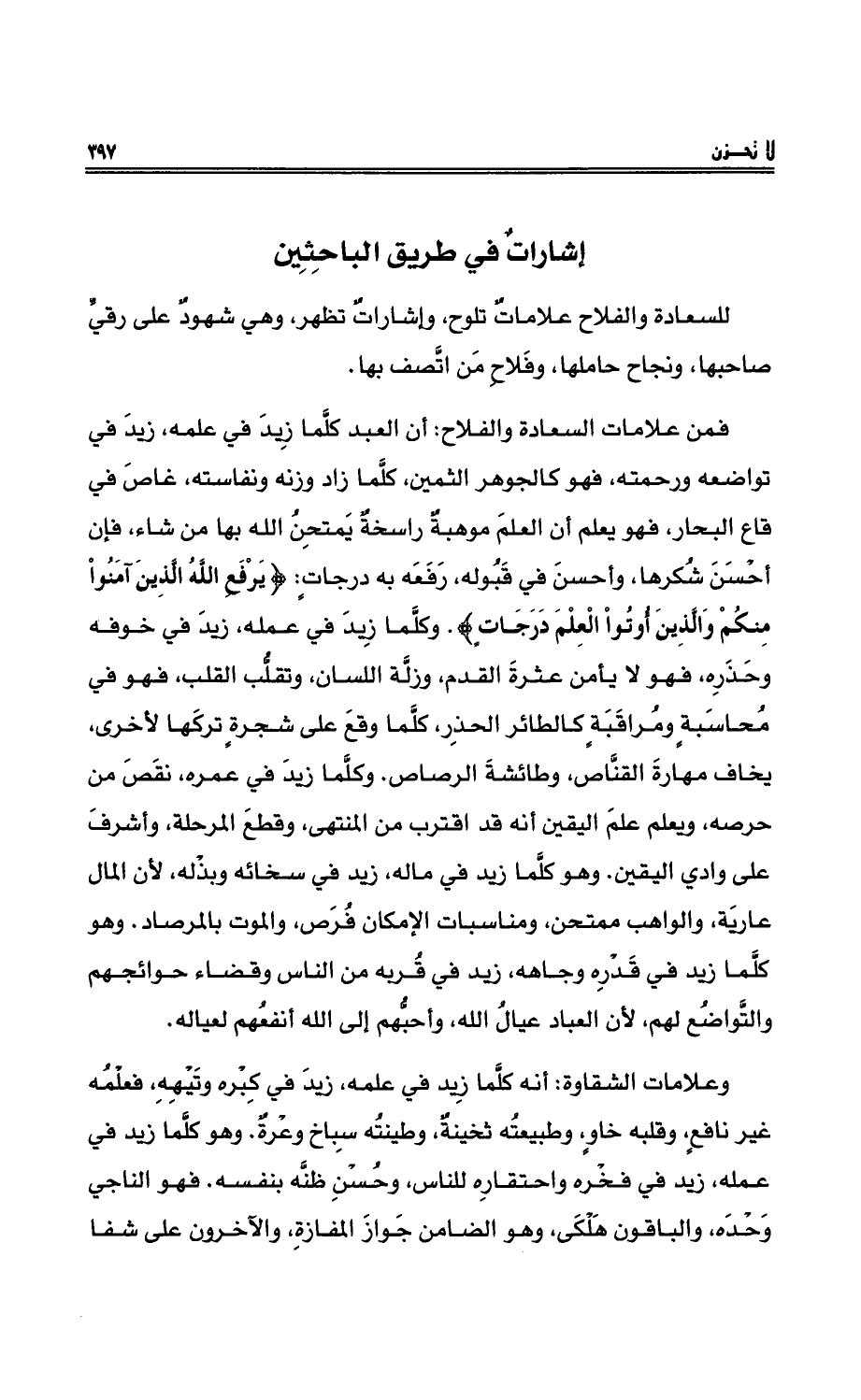 فمنْ علاماتِ السعادةِ والفلاحِ: أنَّ العبد كلَّما زاد وزُنه ونفاستُه، غاص في قاعِ البحارِ، فهو يعلمُ أنَّ العلم موهبةٌ راسخةٌ يمتحِنُ اللهُ بها منْ شاء، فإنْ أحْسَنَ شُكَرَها، وأحسن في قبُولِهِ، رَفعهُ به درجاتٍ {يَرْفَعِ اللَّهُ الَّذِينَ آمَنُوا مِنكُمْ وَالَّذِينَ أُوتُوا الْعِلْمَ دَرَجَاتٍ} . وكلَّما زِيد في عملهِ، زيد في خوفِهِ وحَذَرِه، فهو لا يأمنُ عثرة القدمِ، وزلَّة اللسانِ، وتقلُّب القلبِ، فهو في مُحاسبةٍ ومُراقبةٍ كالطائرِ الحذِر، كلَّما وقع على شجرةٍ تركها لأخرى، يخافُ مهارة القنَّاص، وطائشة الرصاصِ. وكلَّما زيد في عمرِه، نقص من حِرْصِهِ ويعلمُ علم اليقينِ أنَّهُ قدِ اقترب من المنتهى، وقطع المرحلة، وأشرف على وادي اليقين. وهو كلَّما زِيد في مالِه، زيد في سخائِه وبذْلهِ؛ لأنَّ المال عاريةٌ، والواهب ممتحنٌ، ومناسباتِ الإمكانِ فُرصٌ، والموت بالمرصادِ. وهو كلَّما زيد في قدْرِه وجاهِه، زيد في قُربِه من الناسِ وقضاءِ حوائجِهم والتَّواضُعِ لهم؛ لأنَّ العباد عيالُ الله، وأحبُّهم إلى اللهِ أنفعُهم لعيالِه.