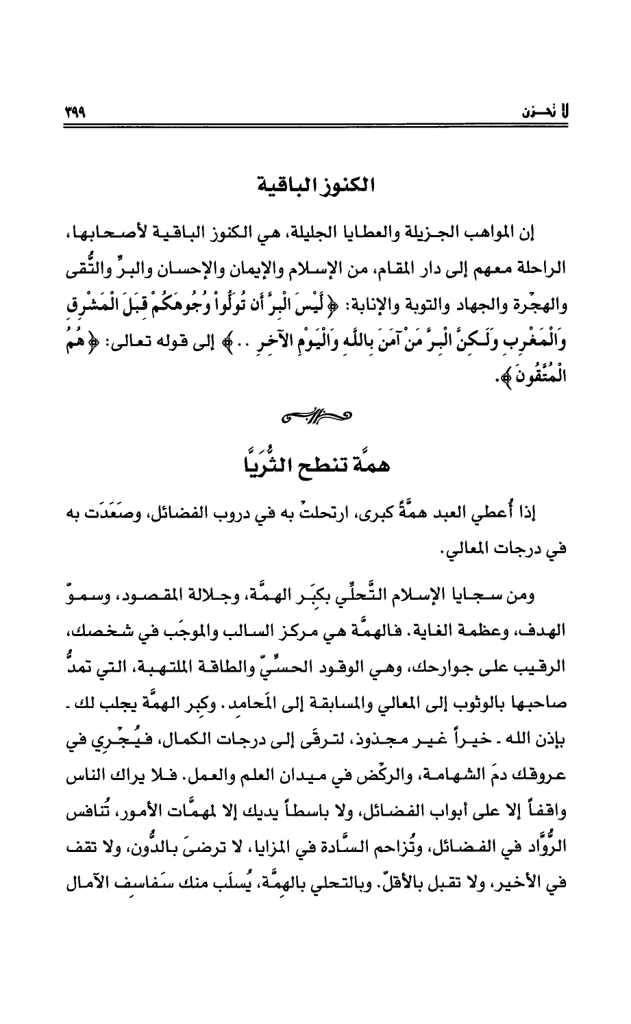 ومنْ سجايا الإسلامِ التَّحلِّي بكِبر الهمَّةِ، وجلالةِ المقصودِ، وسموِّ الهدفِ، وعظمةِ الغايةِ. فالهمَّة هي مركزُ السالبِ والموجبِ في شخصِك، الرقيبُ على جوارحِك، وهي الوقودُ الحسِّيُّ والطاقةُ الملتهبةُ، التي تمدُّ صاحبها بالوثوبِ إلى المعالي والمسابقةِ إلى المحامِدِ. وكِبَرُ الهمَّةِ يجلبُ لك. بإذن اللهِ خيْراً غير مجذوذٍ، لترقى إلى درجاتِ الكمالِ، فيُجْرِي في عروقِك دم الشهامةِ، والركْضِ في ميدانِ العلمِ والعملِ. فلا يراك الناسُ واقفاً إلا على أبواب الفضائلِ، ولا باسطاً يديْك إلا لمهمَّاتِ الأمورِ، تُنافسُ الرُّوَّاد في الفضائلِ، وتُزاحمُ السَّادة في المزايا، لا ترضى بالدُّون، ولا تقفُ في الأخيرِ، ولا تقبلُ بالأقلِّ. وبالتحلِّي بالهِمَّةِ، يُسلبُ منك سفساف الآمال