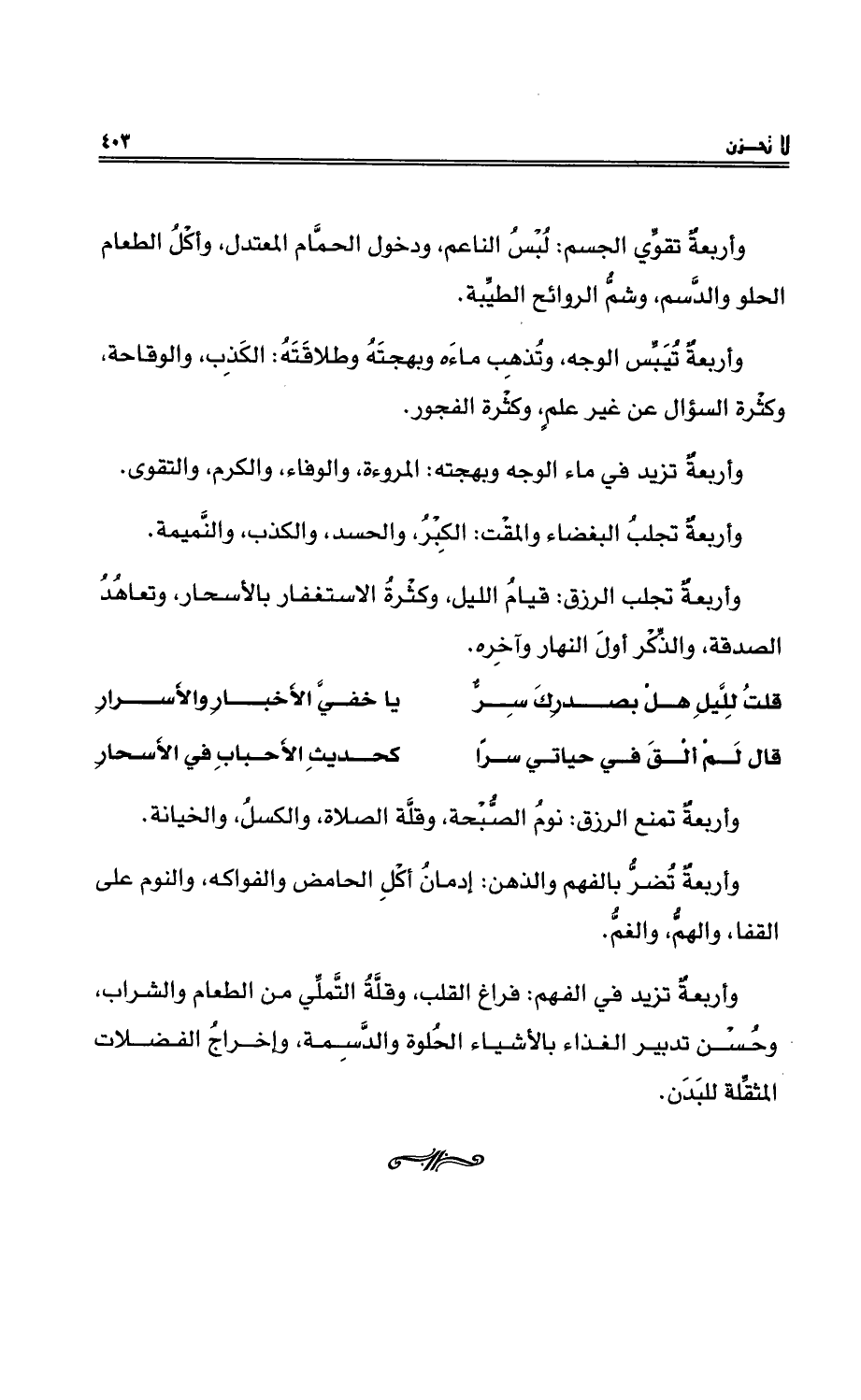 وأربعةٌ تقوِّي الجسم: لُبْسُ الناعمِ، ودخولِ الحمَّامِ المعتدلِ، وأكلُ الطعامِ الحلوِ والدَّسمِ، وشمُّ الروائحِ الطيَّبةِ.