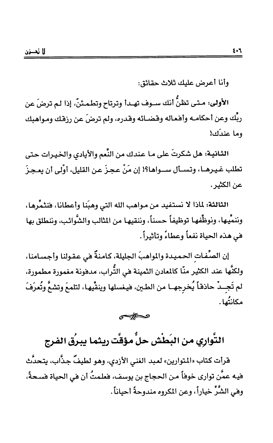 قرأتُ كتاب (المتوارين) لعبدِ الغني الأزديِّ، وهو لطيفٌ جذَّاب، يتحدَّث فيه عمَّن توارى خوفاً من الحجاجِ بن يوسف، فعلمتُ أنَّ في الحياةِ فسحةً، وفي الشَّرِّ خياراً، وعنِ المكروهِ مندوحةً أحياناً.