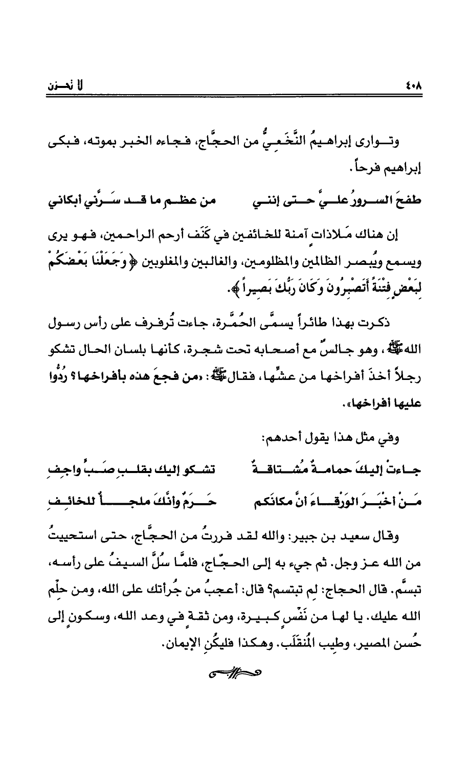 وقال سعيدُ بنُ جبيرٍ: واللهِ لقد فررتُ من الحجَّاج، حتى استحييتُ من اللهِ عزَّ وجلَّ. ثم جيءَ به إلى الحجّاج، فلمَّا سُلَّ السيفُ على رأسِه، تبسَّم. قال الحجاجُ: لِم تبتسمُ؟ قال: أعجبُ منْ جُرأتك على اللهِ، ومن حِلْمِ الله عليك. يا لها من نفْسٍ كبيرةٍ، ومن ثقةٍ في وعدِ اللهِ، وسكونٍ إلى حُسْنِ المصيرِ، وطِيبِ المُنقلَب. وهكذا فليكُنِ الإيمانُ.