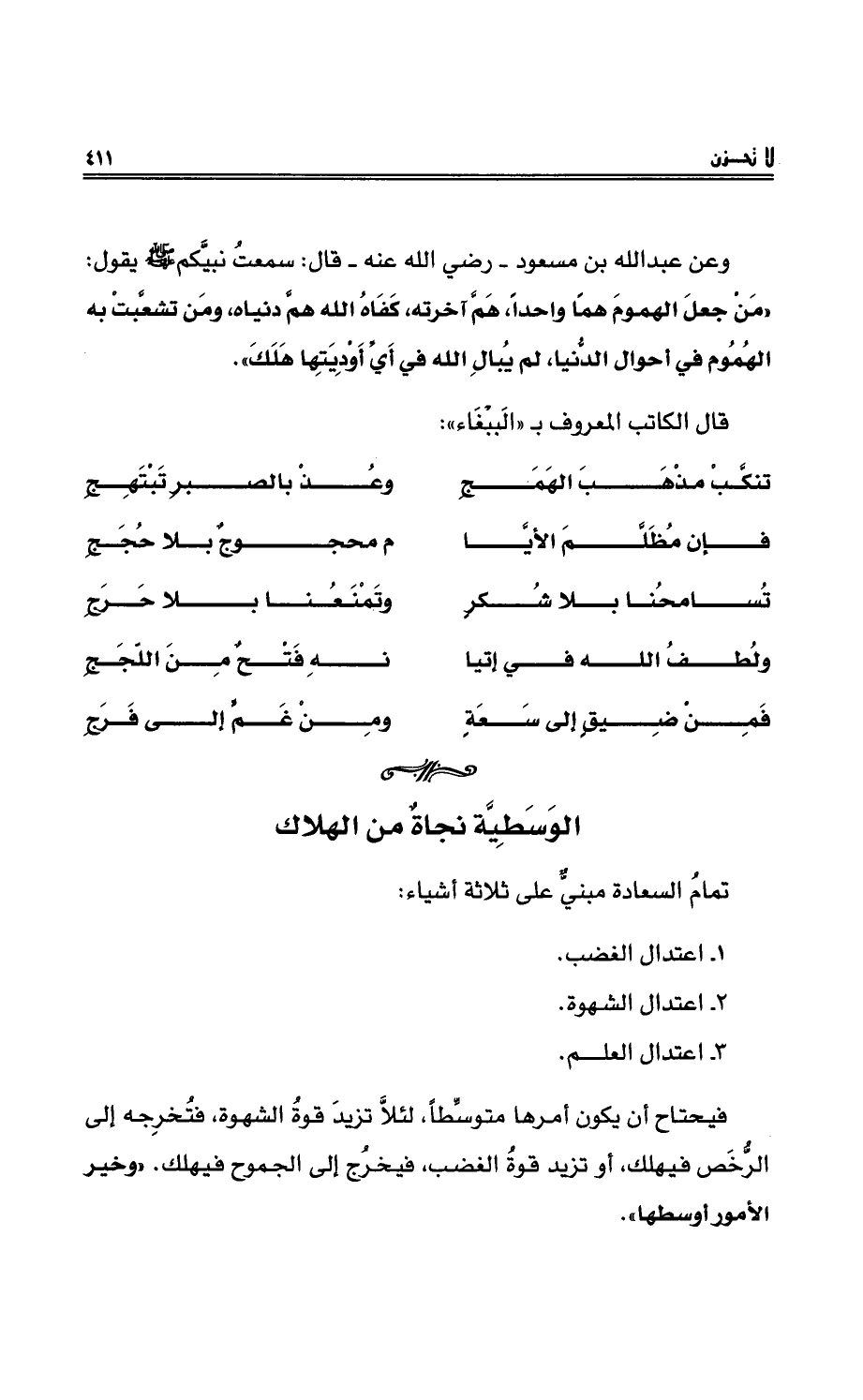 فيحتاجُ أن يكون أمرُها متوسِّطاً، لئلاَّ تزيد قوةُ الشهوةِ، فتُخرِجه إلى الرُّخصِ فيهلِك، أو تزيدُ قوةُ الغضبِ، فيخرُج إلى الجموحِ فيهلك. ((وخيرُ الأمورِ أوسطُها)) .