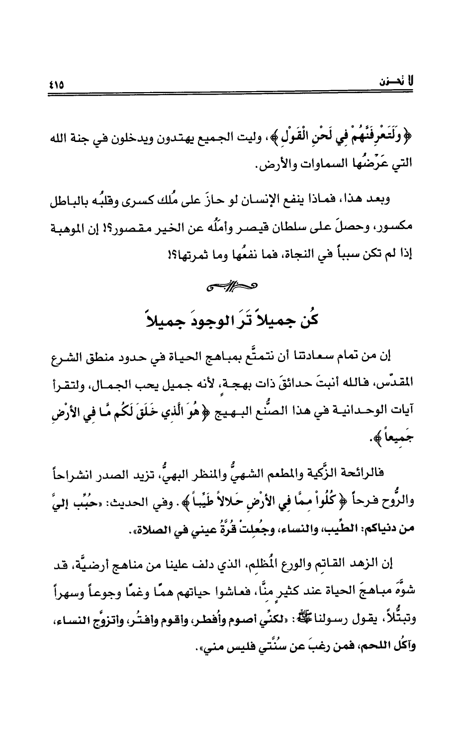 إنَّ منْ تمامِ سعادتِنا أنْ نتمتَّع بمباهج الحياةِ في حدودِ منطقِ الشرعِ المقدّسِ، فاللهُ أنبت حدائق ذات بهجةٍ، لأنهُ جميلُ يحبُ الجمالَ، ولتقرأُآياِ الوحدانية في هذا الصُّنع البهيج {هُوَ الَّذِي خَلَقَ لَكُم مَّا فِي الأَرْضِ جَمِيعاً} .