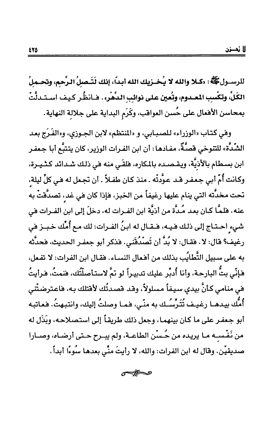 وفي كتاب «الوزراء» للصابي، و «المنتظم» لابنِ الجوزي، و «الفَرَجِ بعد الشِّدَّةِ» للتنوخي قصَّةٌ، مفادُها: أن ابن الفراتِ الوزير، كان يتتبَّعُ أبا جعفرٍ بن بسطامٍ بالأذِيَّة، ويقصدُه بالمكاره، فلقي منه في ذلك شدائد كثيرةً، وكانت أُمّ أبي جعفر قد عوَّدته - منذُ كان طفلاً - أنْ تجعل له في كلِّ ليلةٍ، تحت مخدَّته التي ينامُ عليها رغيفاً من الخبزِ، فإذا كان في غدٍ، تصدَّقتْ به عنه. فلمَّا كان بعد مُدَّة من أذيَّةِ ابنِ الفراتِ له، دخل إلى ابن الفراتِ في شيءٍ احتاج إلى ذلك فيه، فقال له ابنُ الفراتِ: لك مع أُمِّك خُبْزٌ في رغيف؟ قال: لا. فقال: لابُدَّ أن تصدُقني. فذكر أبو جعفر الحديث، فحدَّثه به على سبيل التَّطايُبِ بذلك منْ أفعالِ النساءِ. فقال ابنُ الفراتِ: لا تفعلْ، فإنّي بتُّ البارحة، وأنا أُدبِّرُ عليك تدبيراً لو تمَّ لاستأصلْتُك، فنمتُ، فرأيتُ في منامي كأنَّ بيدي سيفاً مسلولاً، وقد قصدتُك لأقتلك به، فاعترضتْني أُمُّك بيدِها رغيفٌ تُترِّسُك به منّي، فما وصلتُ إليك، وانتبهتُ. فعاتبه أبو جعفر على ما كان بينهما، وجعل ذلك طريقاً إلى استصلاحِه، وبذل لهُ منْ نفْسِه ما يريدُه منْ حُسْنِ الطاعةِ، ولم يبرحْ حتى أرضاهُ، وصارا صديقيْن. وقال له ابنُ الفراتِ: واللهِ، لا رأيت منِّي بعدها سُوءاً أبداً.