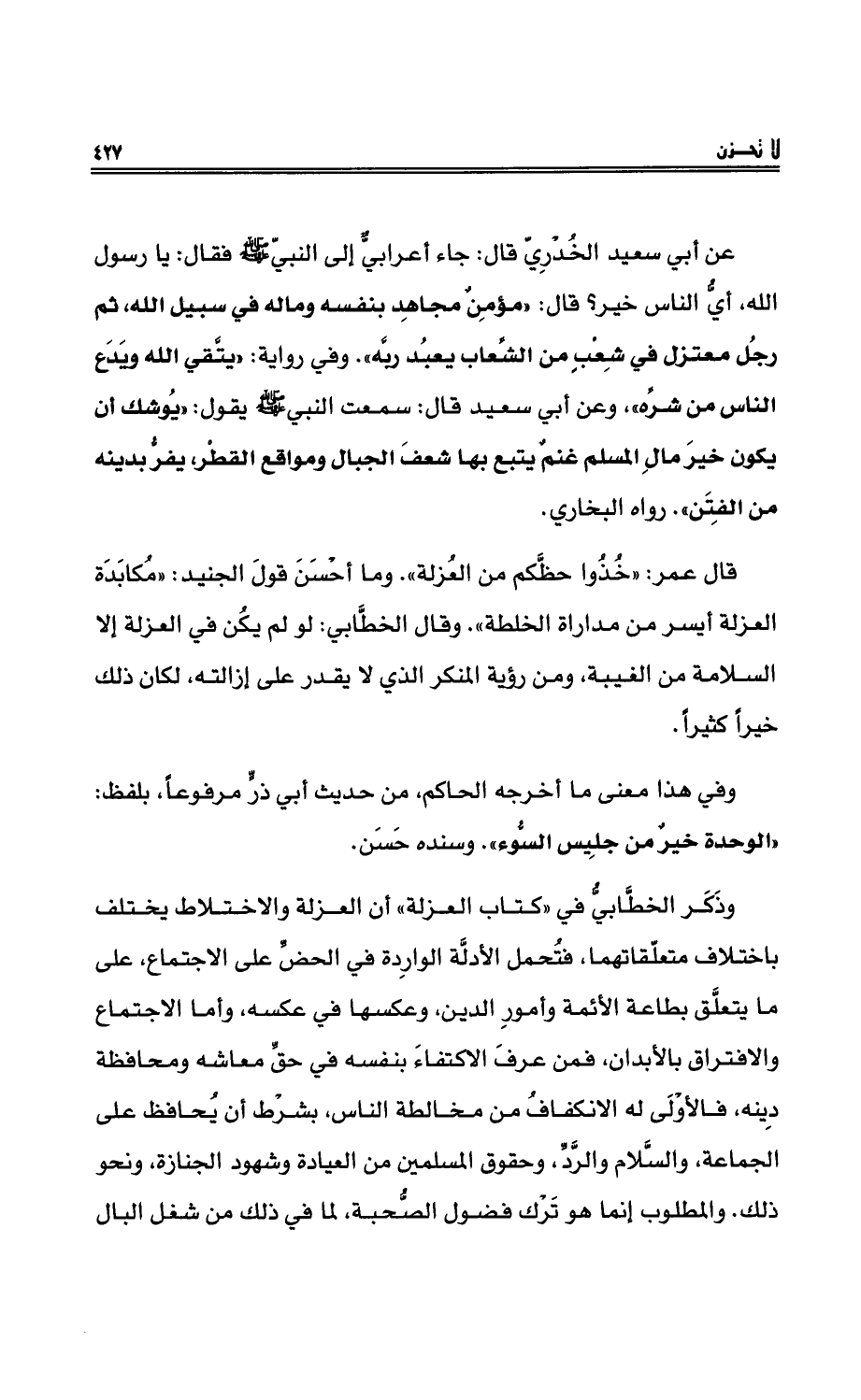 عن أبي سعيد الخُدْريّ قال: جاء أعرابيٌّ إلى النبيِّ - صلى الله عليه وسلم - فقال: يا رسول اللهِ، أيُّ الناس خيْرٌ؟ قال: ((مؤمِنٌ مجاهِدٌ بنفسِه ومالِه في سبيلِ اللهِ، ثم رجُلٌ معتزلٌ في شِعْبٍ من الشِّعابِ يعبُد ربَّه)) . وفي روايةٍ: ((يتَّقي الله ويدع الناس من شرِّه)) ، وعنْ أبي سعيدٍ قال: سمعتُ النبي - صلى الله عليه وسلم - يقولُ: ((يُوشكُ أنْ يكون خير مالِ المسلم غنمٌ يتبعُ بها شعْفَ الجبالِ ومواقع القطْرِ، يفرُّ بدينِه من الفِتنِ)) . رواه البخاريُّ.