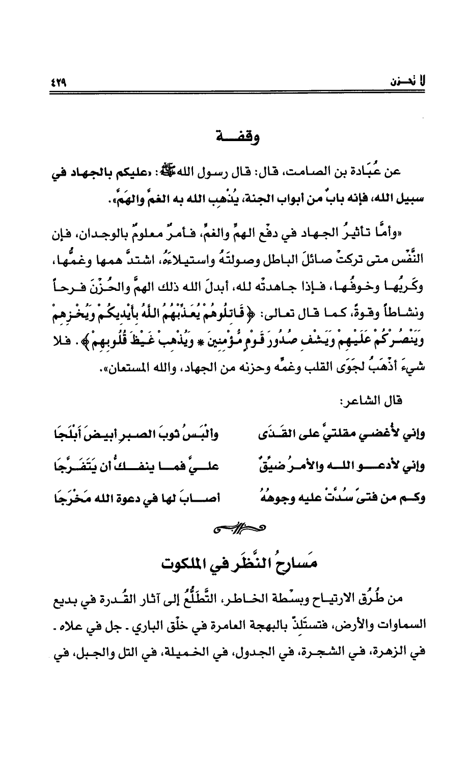 عن عُباد بنِ الصامتِ قال: قال رسولُ اللهِ - صلى الله عليه وسلم -: ((عليكمْ بالجهاد في سبيلِ اللهِ، فإنه بابٌ من أبوابِ الجنةِ، يُذهِبُ اللهُ به الغمَّ والهمَّ)) .