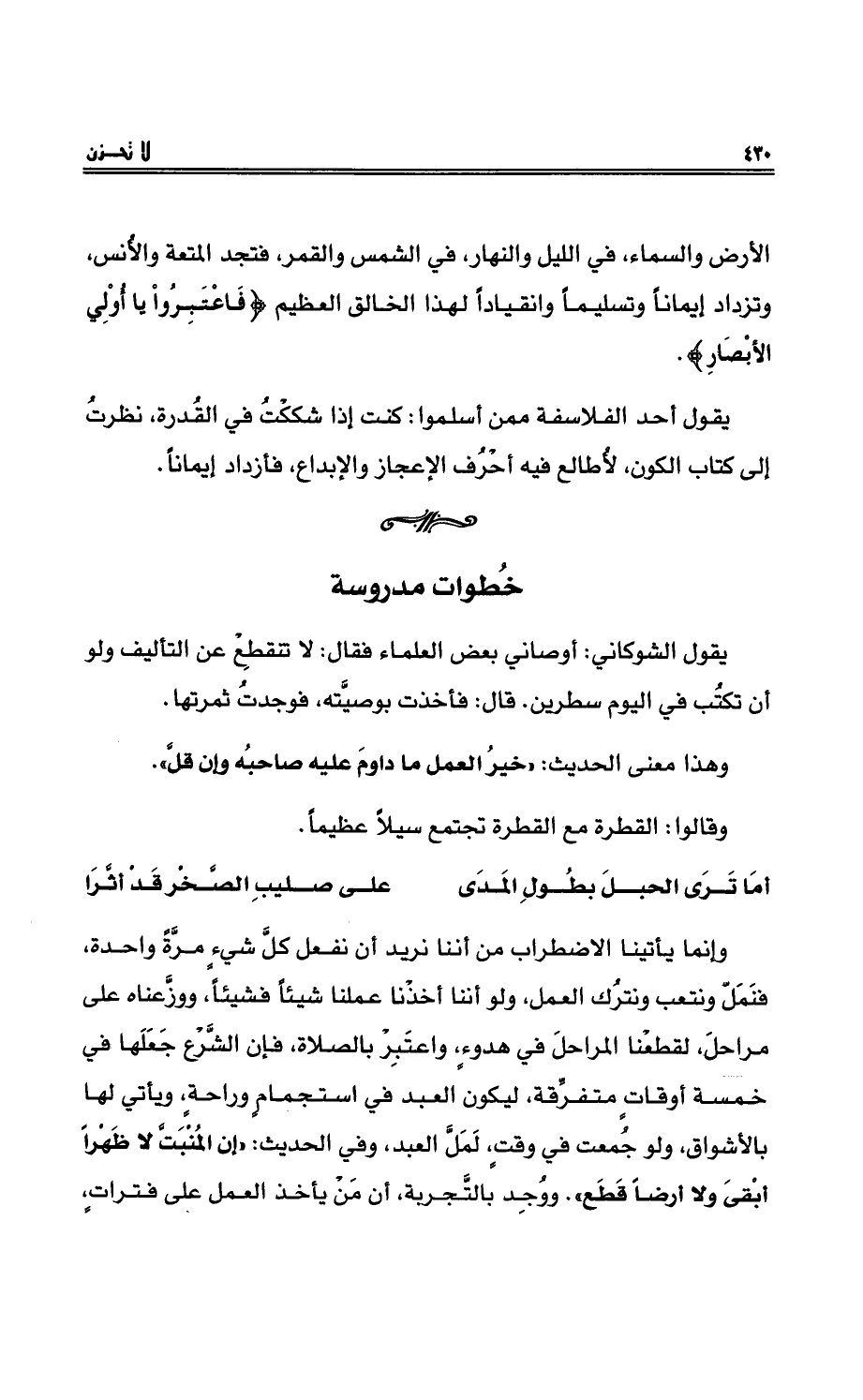وهذا معنى الحديث: ((خيرُ العملِ ما داوم عليه صاحبُه وإنْ قلَّ)) وقال: القطرةُ مع القطرةِ تجتمعُ سيلاً عظيماً.