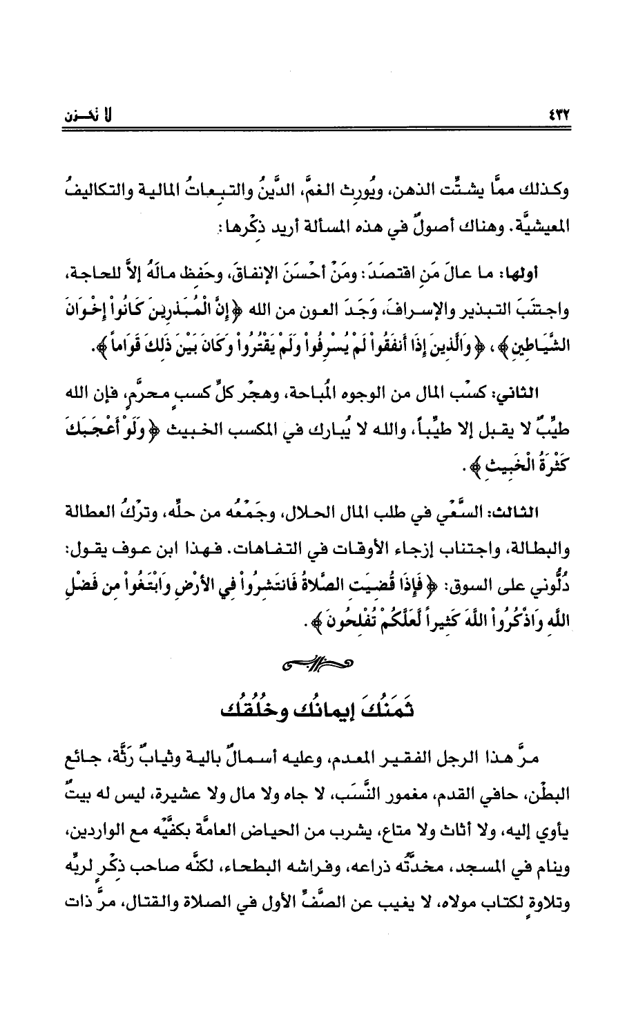 الثالث: السَّعْيُ في طلبِ المالِ الحلالِ، وجمْعُه منْ حلِّه، وتركُ العطالةِ والبطالةِ، واجتنابِ إزجاءِ الأوقاتِ في التفاهاتِ، فهذا ابنُ عوف يقول: دُلُّوني على السوقِ: {فَإِذَا قُضِيَتِ الصَّلَاةُ فَانتَشِرُوا فِي الْأَرْضِ وَابْتَغُوا مِن فَضْلِ اللَّهِ وَاذْكُرُوا اللَّهَ كَثِيراً لَّعَلَّكُمْ تُفْلِحُونَ} .