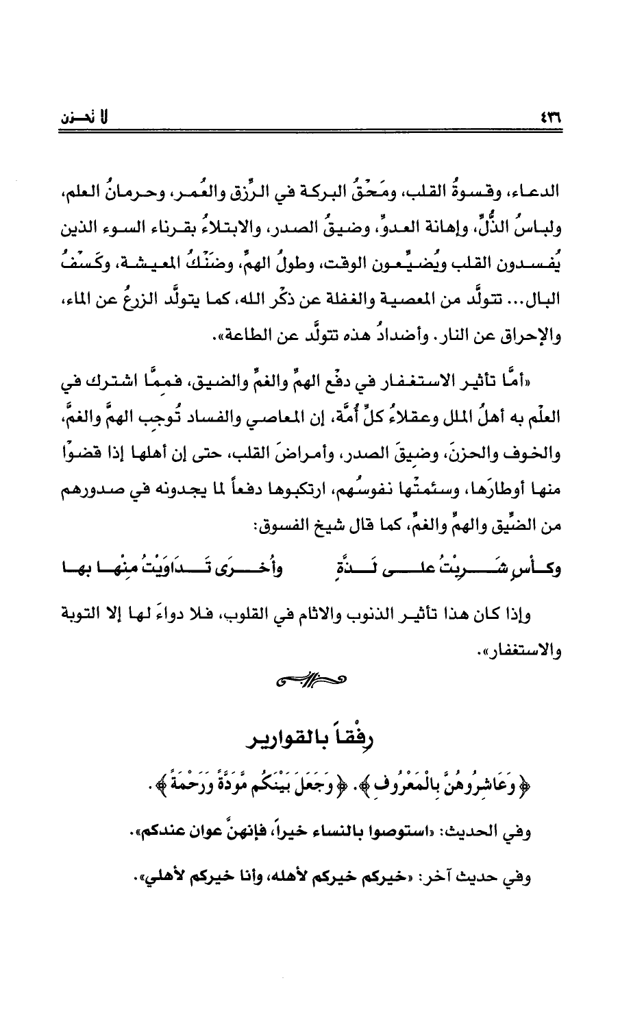 «أمَّا تأثيرُ الاستغفارِ في دفْع الهمِّ والغمِّ والضيقِ، فمِمَّا اشترك في العلْمِ به أهلُ المللِ وعقلاءُ كلِّ أمَّة، إنَّ المعاصي والفساد تُوجِب الهمَّ والغمَّ، والخوف والحزن، وضِيق الصدر، وأمراض القلب، حتى إنّ أهلها ذا قضوا منها أوطارها، وسئمتْها نفوسُهم، ارتكبوها دفعاً لما يجدونهُ في صدورهِم من الضِّيقِ والهمِّ والغمِّ، كما قال شيخُ الفسوقِ: