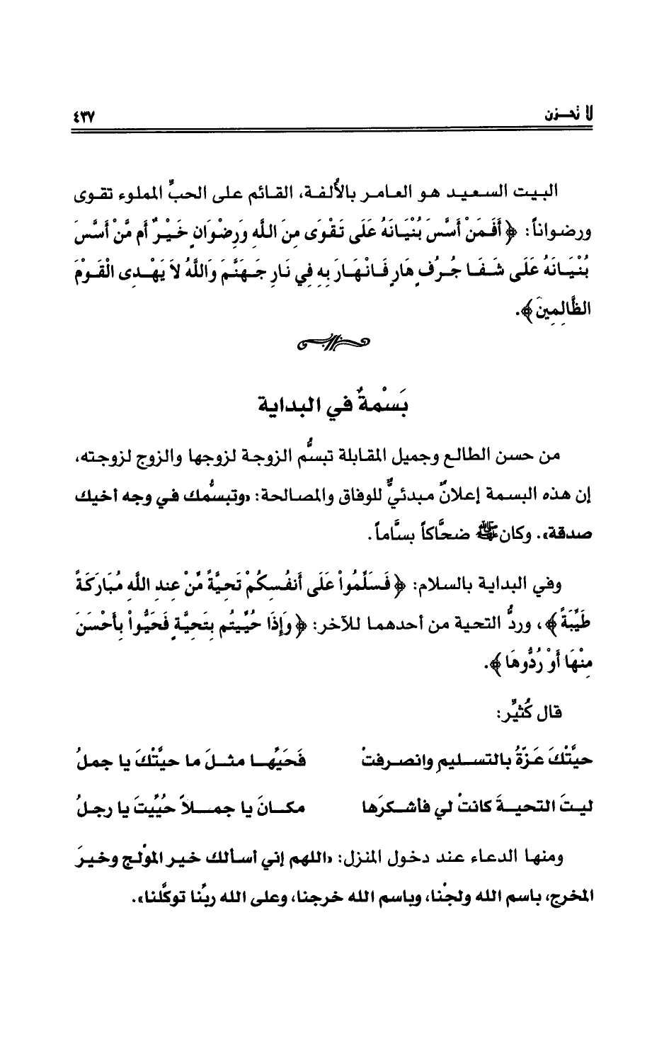 وفي البدايةِ بالسلامِ: {فَسَلِّمُوا عَلَى أَنفُسِكُمْ تَحِيَّةً مِّنْ عِندِ اللَّهِ مُبَارَكَةً طَيِّبَةً} ، وردُّ التحيةِ من أحدِهما للآخرِ: {وَإِذَا حُيِّيْتُم بِتَحِيَّةٍ فَحَيُّواْ بِأَحْسَنَ مِنْهَا أَوْ رُدُّوهَا} .