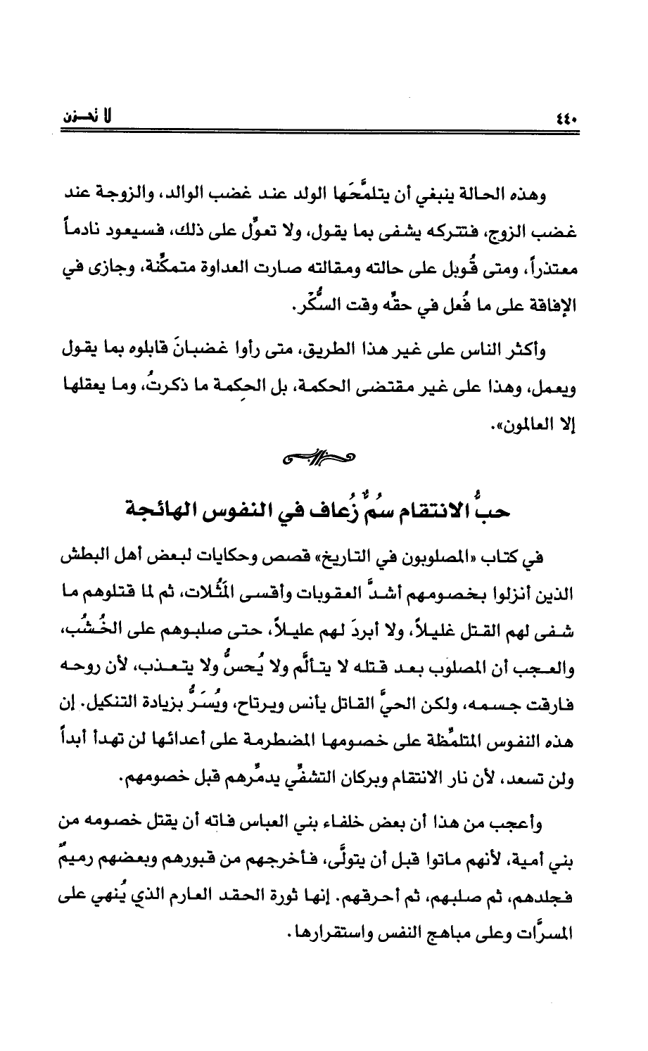 في كتاب «المصلوبون في التاريخ» قصصٌ وحكاياتٌ لبعضِ أهل البطشِ الذين أنزلوا بخصومهم أشدَّ العقوباتِ وأقسى المُثلات، ثم لما قتلوهم ما شفى لهم القتلُ غليلاً، ولا أبرد لهم عليلاً، حتى صلبوهُم على الخُشُب، والعَجَبُ أن المصلوب بعد قتلِهِ لا يتألَّم ولا يُحِسُّ ولا يتعذبُ، لأن روحه فارقتْ جسمه، ولكن الحيَّ القاتل يأنسُ ويرتاحُ، ويُسرُّ بزيادةِ التنكيلِ. إن هذه النفوس المتلمِّظة على خصومِها المضطرمةَ على أعدائِها لن تهدأ أبداً ولن تسعد، لأن نار الانتقامِ وبركان التشفِّي يدمِّرُهم قبل خصومِهِمْ.