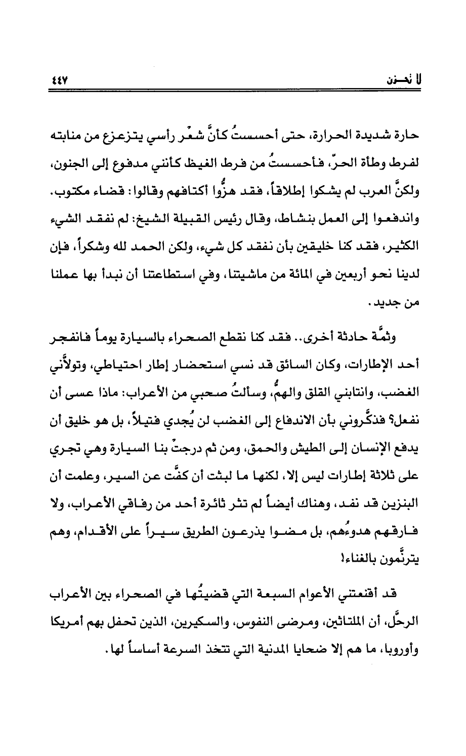 وثمَّة حادثةٌ أخرى.. فقدْ كنا نقطعُ الصحراء بالسيارةِ يوماً فانفجر أحدُ الإطارات، وكان الشائقُ قد نسي استحضار إطار احتياطيٍّ، وتولاني الغضبُ، وانتابني القلقُ والهمُّ، وسألتُ صحبي من الأعرابِ: ماذا عسى أن نفعل؟ فذكَّروني بأن الاندفاع إلى الغضبِ لن يُجدي فتيلاً، بل هو خليقٌ أن يدفع الإنسان إلى الطيشِ والحُمْقِ، ومنْ ثم درجتْ بنا السيارة وهي تجري على ثلاثة إطارات ليس إلا، لكنها ما لبثت أن كفَّتْ عن السير، وعلمت أن البنزين قد نفَدَ، وهناك أيضاً لم تثرْ ثائرة أحدٍ منْ رفاقي الأعرابِ، ولا فارقهُم هدوؤهم، بل مضوْا يذرعون الطريق سيراً على الأقدامِ، وهم يترنَّمون بالغناءِ!
