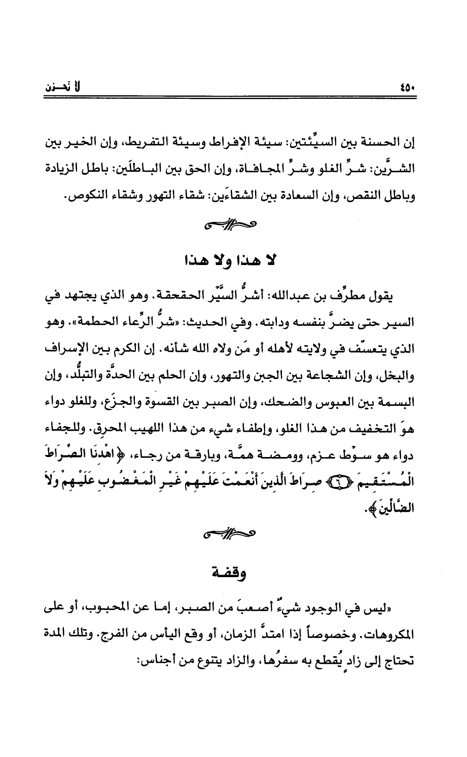 يقولُ مطرِّف بنُ عبد الله: أشرُّ السَّيْرِ الحقحقة. وهو الذي يجتهد في السيرِ حتى يضرَّ بنفسهِ ودابتِه. وفي الحديثِ: ((شرُّ الرِّعاء الحُطَمَةُ)) . وهو الذي يتعسّفُ في ولايتِه لأهلِه أو من ولاه اللهُ شأنه. إن الكرم بين الإسرافِ والبخلِ، وإن الشجاعة بين الجبنِ والتهورِ، وإن الحلم بين الحدَّةِ والتبلُّد، وإن البسمة بين العبوس والضحك، وإن الصبر بين القسوة والجزعِ، وللغلوِّ دواءٌ هو التخفيفُ من هذا الغلوِّ، وإطفاءُ شيءٍ من هذا اللهيب المحرق وللجفاءِ دواء هو سوْطُ عزمٍ، وومضةُ هِمَّة، وبارقةُ من رجاءٍ، {اهدِنَا الصِّرَاطَ المُستَقِيمَ {6} صِرَاطَ الَّذِينَ أَنعَمتَ عَلَيهِمْ غَيرِ المَغضُوبِ عَلَيهِمْ وَلاَ الضَّالِّينَ} .