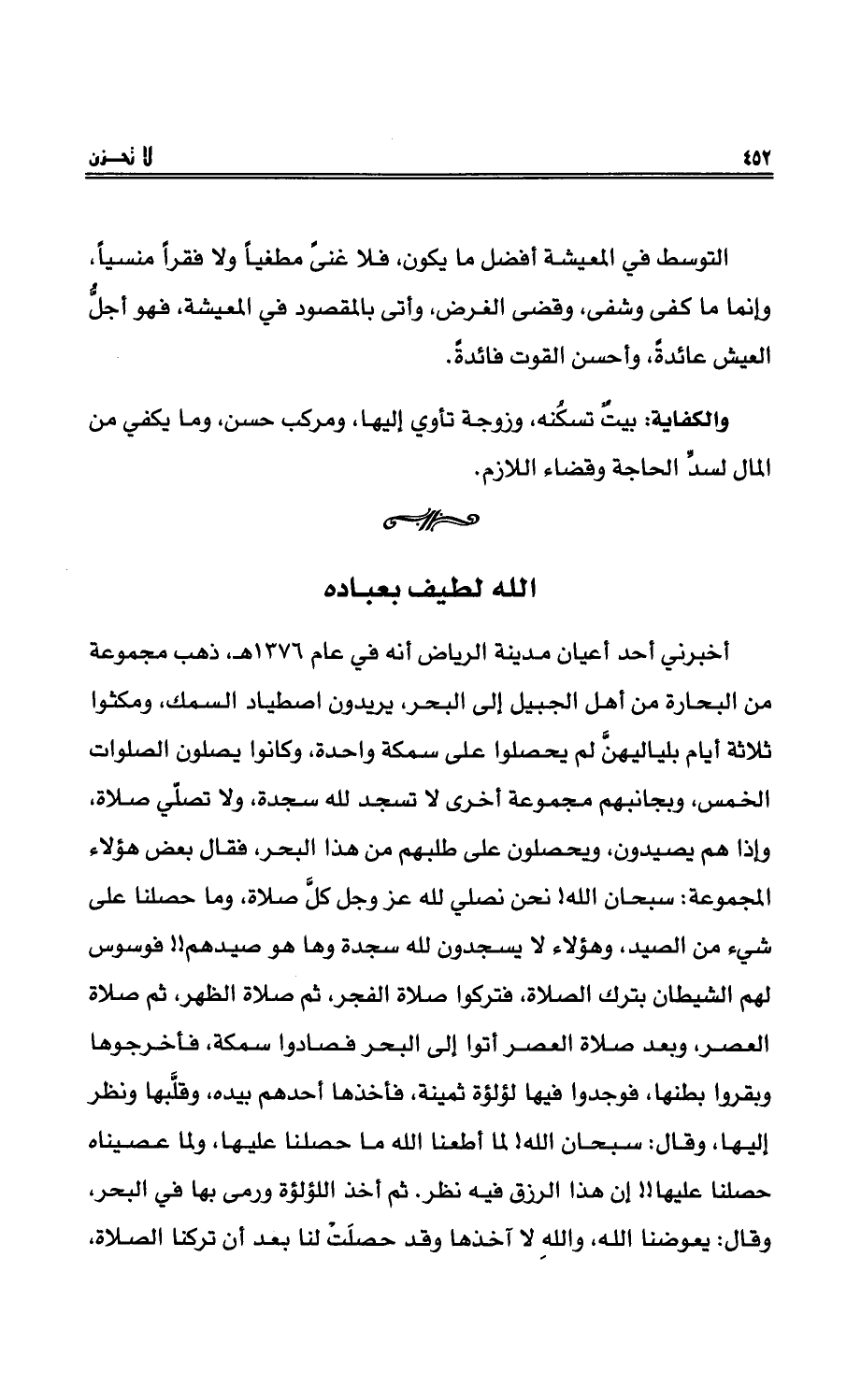 أخبرني أحدُ أعيانِ مدينةِ الرياضِ أنه في عام 1376 هـ، ذهب مجموعةٌ من البحارةِ من أهلِ الجبيلِ إلى البحرِ، يريدون اصطياد السمكِ، ومكثوا ثلاثة أيام بلياليهنَّ لم يحصلُوا على سمكةٍ واحدةٍ، وكانوا يصلون الصلواتِ الخمس، وبجانبهم مجموعةٌ أخرى لا تسجدُ للهِ سجدةً، ولا تصلّي صلاةً، وإذا هم يصيدون، ويحصلون على طلبِهم من هذا البحرِ، فقال بعضُ هؤلاءِ المجموعةِ: سبحان اللهِ! نحن نصلي للهِ عزَّ وجلَّ صلاةٍ، وما حصلْنا على شيءٍ من الصيدِ، وهؤلاء لا يسجدون للهِ سجدةً وها هو صيدُهم!! فوسوس لهم الشيطانُ بتركِ الصلاةِ، فتركُوا صلاة الفجرِ، ثم صلاة الظهرِ، ثم صلاة العصرِ، وبعد صلاةِ العصرِ أتوْا إلى البحرِ فصادُوا سمكةً، فأخرجُوها وبقرُوا بطنها، فوجدُا فيها لؤلؤةً ثمينةً، فأخذها أحدُهم بيدِه، وقلَّبها ونظر إليها، وقال: سبحان اللهِ! لما أطْعنا الله ما حصلنا عليها، ولما عيناه حصلْنا عليها!! إن هذا الرزق فيه نظرٌ. ثم أخذ اللؤلؤة ورمى بها في البحرِ، وقال: يعوضُنا اللهُ، واللهِ لا آخذُها وقد حصلتْ لنا بعد أن تركْنا الصلاة،