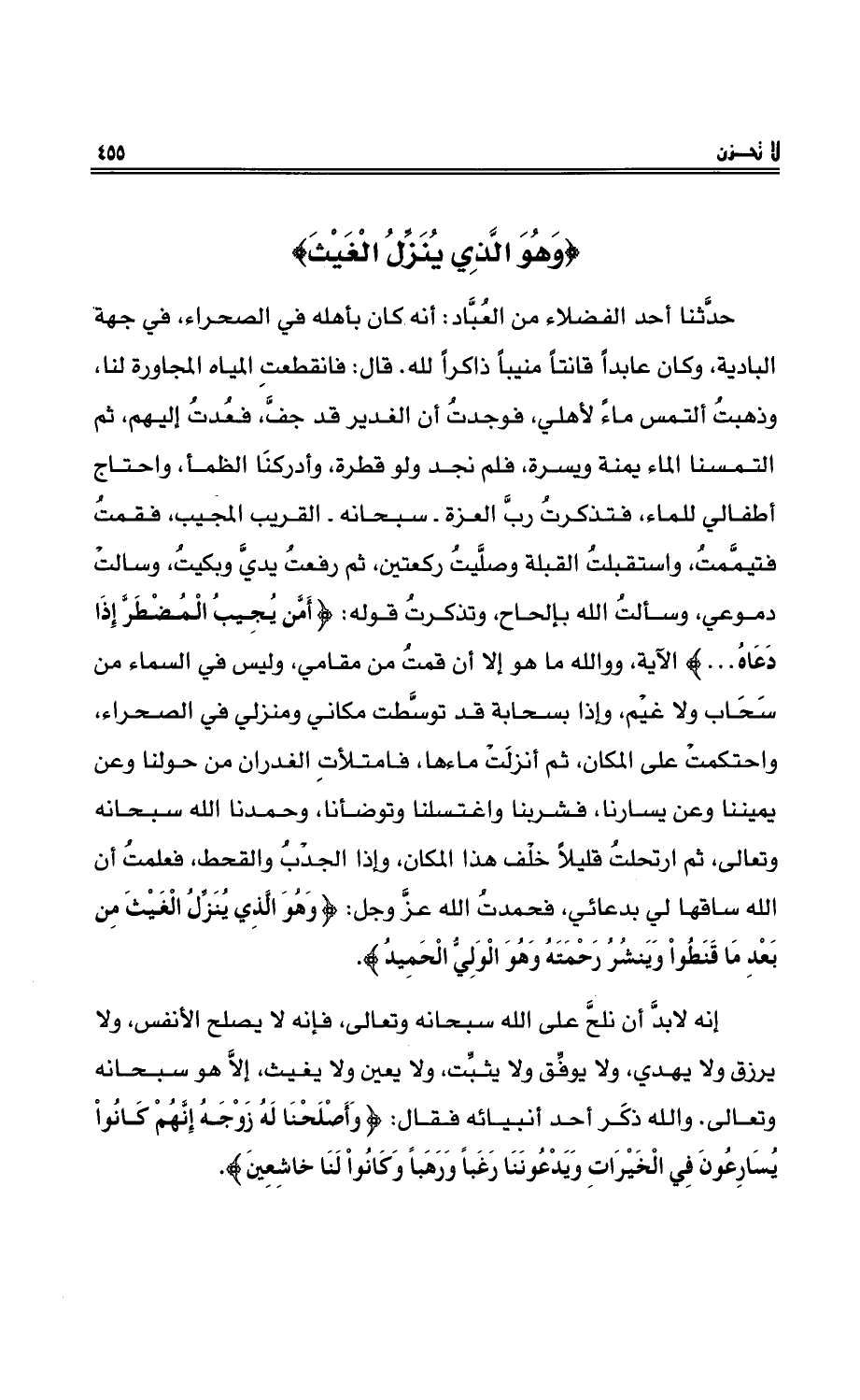 حدَّثنا أحدُ الفضلاءِ من العُبَّادِ: أنه كان بأهلِه في الصحراءِ، في جهةِ الباديةِ، وكان عابداً قانتاً منيباً ذاكراً للهِ. قال: فانقطعتْ المياهُ المجاورةُ لنا، وذهبتُ ألتمسُ ماءً لأهلي، فوجدتُ أن الغدير قد جفَّ، فعُدتُ إليهم، ثم التمسْنا الماء يمْنةً ويسْرَةً، قلم نجدْ ولو قطرةً، وأدركنا الظمأُ، واحتاج أطفالي للماء، فتذكرتُ ربَّ العزةِ - سبحانه- القريب المجيب، فقمتُ فتيمَّمتُ، واستقبلتُ القبلة وصلَّيتُ ركعتين، ثم رفعتُ يديَّ وبكيتُ، وسالتْ دموعي، وسألتُ الله بإلحاحٍ، وتذكرتُ قوله: {أَمَّن يُجِيبُ الْمُضْطَرَّ إِذَا دَعَاهُ.....} الآية، وواللهِ ما هو إلا أن قمتُ من مقامي، وليس في السماء من سحاب ولا غيْم، وإذا بسحابة قد توسَّطتْ مكاني ومنزلي في الصحراءِ، واحتكمتْ على المكان، ثم أنزلتْ ماءها، فامتلأتِ الغدرانُ من حولِنا وعن يميننا وعن يسارِنا، فشرْبنا واغتسْلنا وتوضأنا، وحمدْنا الله سبحانه وتعالى، ثم ارتحلتُ قليلاً خلْف هذا المكان، وإذا الجدْبُ والقحطُ، فعلمتُ أن الله ساقها لي بدعائي، فحمدتُ الله عزَّ وجلَّ: {وَهُوَ الَّذِي يُنَزِّلُ الْغَيْثَ مِن بَعْدِ مَا قَنَطُوا وَيَنشُرُ رَحْمَتَهُ وَهُوَ الْوَلِيُّ الْحَمِيدُ} .