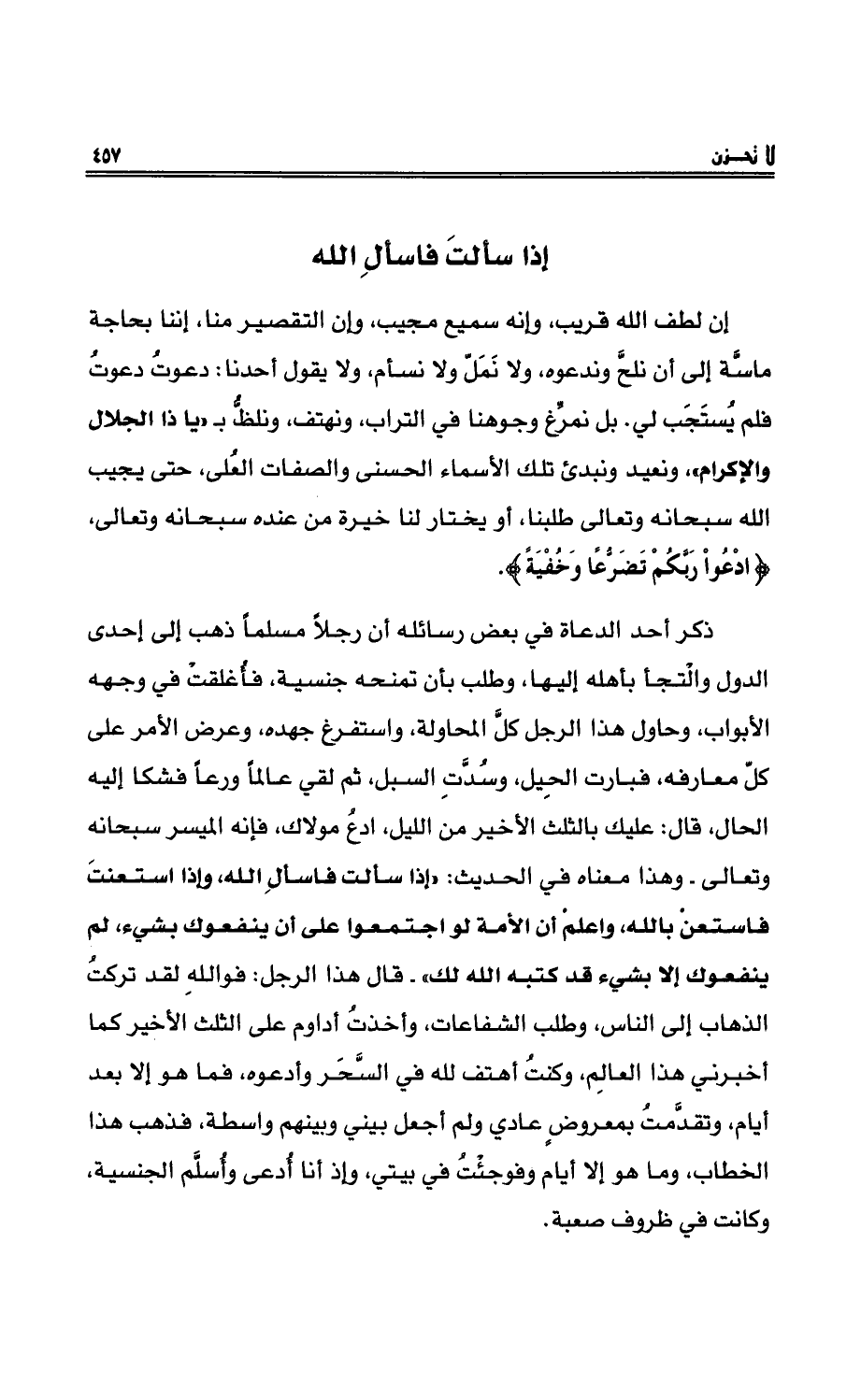ذكر أحدُ الدعاةِ في بعضِ رسائِله أن رجلاً مسلماً ذهب إلى إحدى الدول والتجأ بأهِله إليها، وطلب بأن تمنحه جنسية، فأغلقتْ في وجههِ الأبوابُ، وحاول هذا الرجل كلَّ المحاولةِ، واستفرغ جهده، وعرضَ الأمرَ على كلِّ معارفِه، فبارتِ الحِيَلُ، وسُدَّتِ السبل، ثم لقي عالماً ورِعاً فشكا إليه الحال، قال: عليك بالثلث الأخيرِ من الليلِ، ادع مولاك، فإنه الميسرُ سبحانه وتعالى - وهذا معناه في الحديث: ((إذا سألتَ فاسألِ الله، وإذا استعنت فاستعنْ بالله، واعلمْ أن الأمة لو اجتمعوا على أن ينفعوك بشيءٍ، لم ينفعوك إلا بشيءٍ قد كتبه اللهُ لك)) - قال هذا الرجل: فواللهِ لقد تركتُ الذهاب إلى الناس، وطلب الشفاعات، وأخذتُ أداومُ على الثلث الأخير كما أخبرني هذا العالِم، وكنتُ أهتفُ للهِ في السَّحرِ وأدعوه، فما هو إلا بعد أيام، وتقدَّمتُ بمعروضٍ عادي ولم أجعل بيني وبينهم واسطة، فذهب هذا الخطابُ، وما هو إلا أيام وفوجئْتُ في بيتي، وإذ أنا أُدعى وأسلَّمُ الجنسية، وكانت في ظروفٍ صعبةٍ.