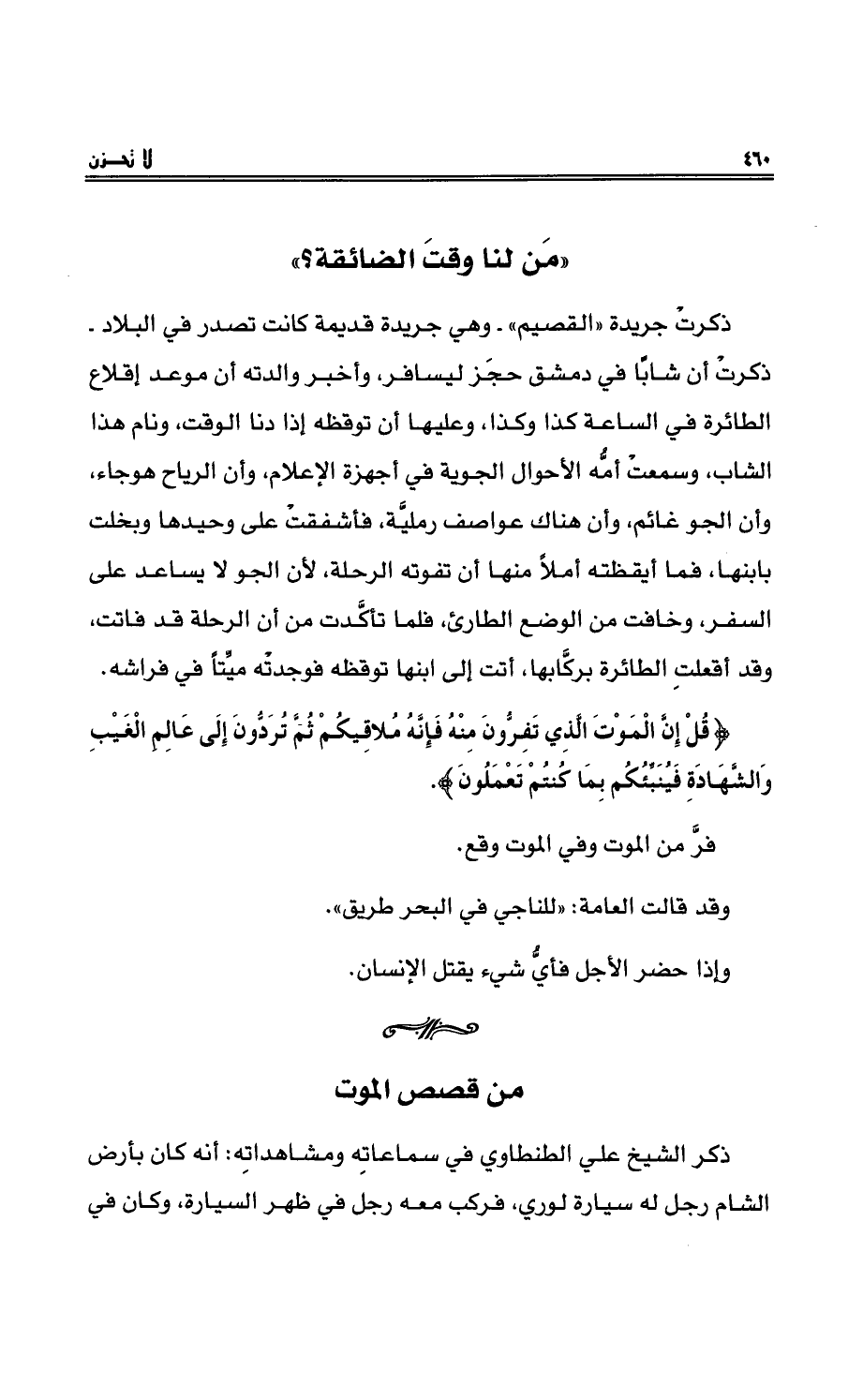 ذكرتْ جريدةُ «القصيم» -وهي جريدةٌ قديمةٌ كانتْ تصدُر في البلاد- ذكرتْ أن شابّاً في دمشق حجزَ ليسافرَ، وأخبر والدته أنَّ موعدَ إقلاعِ الطائرةِ في الساعةِ كذا وكذا، وعليها أنْ توقظه إذا دنا الوقتُ، ونام هذا الشابُّ، وسمعتْ أمُّه الأحوال الجوية في أجهزةِ الإعلامِ، وأنَّ الرياح هوجاءُ وأنَّ الجوَّ غائمٌ، وأنَّ هناك عواصف رمليَّةً، فأشفقتْ على وحيدها وبخلتْ بابنها، فما أيقظتْه أملاً منها أن تفوته الرحلةُ، لأنَّ الجوَّ لا يساعدُ على السفرِ، وخافْت منْ الوضعِ الطارئِ، فلما تأكَّدتْ من ْ أنَّ الرحلة قد فاتتْ، وقد أقعلتِ الطائرةُ بركَّابِها، أتتْ إلى ابنِها توقظُه فوجدتْه ميِّتاً في فراشِه.
