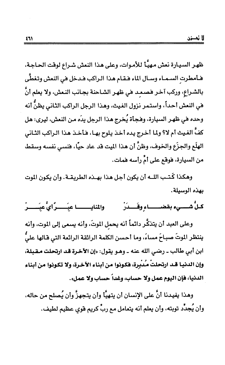 ظهرِ السيارة نَعشٌ مهيَّأ للأمواتِ، وعلى هذا النعش شراعٌ لوقتِ الحاجةِ، فأمطرتِ السماءُ وسال الماءُ فقام هذا الراكبُ فدخل في النعش وتغطَّى بالشراعِ، وركب آخرُ فصعِد في ظهرِ الشاحنةِ بجانبِ النعشِ، ولا يعلمُ أنَّ في النعشِ أحداً، واستمرَّ نزولُ الغيثِ، وهذا الرجلُ الراكبُ الثاني يظنُّ أنه وحده في ظهر السيارةِ، وفجأةً يْخرج هذا الرجلُ يده من النعشِ، ليرى: هلْ كفَّ الغيثُ أم لا؟ ولما أخرج يده أخذ يلوحُ بها، فأخذ هذا الراكبُ الثانيِ الهلعُ والجزعُ والخوفُ، وظنَّ أن هذا الميت قد عاد حيّاً، فنسي نفسه وسقط من السيارةِ، فوقع على أمِّ رأسهِ فمات.
