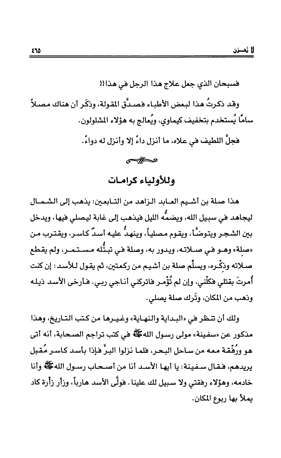 ولك أن تنظر في «البداية والنهاية» وغيرها من كتبِ التاريخِ، وهذا مذكورٌ عن «سفينة» مولى رسولِ اللهِ - صلى الله عليه وسلم - في كتبِ تراجمِ الصحابةِ، أنه أتى هو ورفْقةٌ معهُ من ساحلِ البحرِ، فلما نزلُوا البرَّ فإذا بأسدٍ كاسر مُقبلٍ يريدُهم، فقال سفينةُ: يا أيها الأسدُ أنا من أصحابِ رسولِ الله ِ - صلى الله عليه وسلم - وأنا خادمُه، وهؤلاء رفقتي ولا سبيل لك علينا. فولَّى الأسدُ هارباً، وزأر زأْرةً كاد يملأ بها ربوع المكانِ.