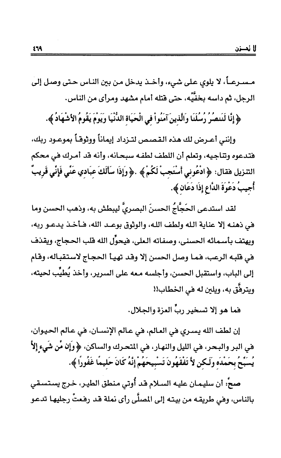 لقد استدعى الحجَّاجُ الحسن البصريَّ ليبطش به، وذهب الحسنُ وما في ذهنه إلا عنايةُ اللهِ ولطفُ الله، والوثوقُ بوعِد اللهِ، فأخذ يدعو ربَّه، ويهتفُ بأسمائِه الحسنى، وصفاتِه العلى، فيحوِّل اللهُ قلب الحجاجِ، ويقذفُ في قلبه الرعب، فما وصل الحسَنُ إلا وقد تهيأ الحجاجُ لاستقبالِه، وقام إلى البابِ، واستقبل الحَسَنَ، وأجلسَه معه على السريرِ، وأخذ يُطيِّب لحيته، ويترفَّقُ به، ويُلينُ له في الخطابِ!! فما هو إلا تسخيرُ ربِّ العزةِ والجلالِ.