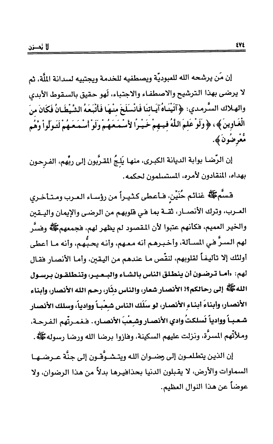 قَسَّمَ - صلى الله عليه وسلم - غنائم حُنَيْنٍ، فأعطى كثيراً من رؤساءِ العربِ ومتأخري العرب، وترك الأنصار، ثقةً بما في قلوبِهم من الرضى والإيمانِ واليقين والخيرِ العميمِ، فكأنهم عتبُوا لأن المقصود لم يظهر لهم، فجمعهم - صلى الله عليه وسلم - وفسَّرَ لهم السرَّ في المسألةِ، وأخبرهم أنه معهم، وأنه يحبُّهم، وأنه ما أعطى أولئك إلا تأليفاً لقلوبهم، لنقْصِ ما عندهم من اليقين، وأما الأنصارُ فقال لهم: ((أما ترضون أن ينطلق الناس بالشاء والبعير، وتنطلقون برسولِ اللهِ - صلى الله عليه وسلم - إلى رحالِكم؟! الأنصار شعارٌ، والناسُ دِثار، رحم اللهُ الأنصار، وأبناء الأنصارِ، وأبناء أبناءِ الأنصارِ، لو سلك الناسُ شِعْباً ووادياً، وسلك الأنصارُ شعباً ووادياً لسلكتُ وادي الأنصارِ وشِعْبَ الأنصارِ)) . فغمرتْهم الفرحةُ. وملأتْهم المسرَّةُ، ونزلتْ عليهم السكينةُ، وفازوا برضا اللهِ ورضا رسولِهِ - صلى الله عليه وسلم -.