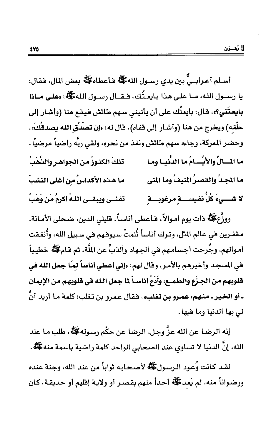 ووزَّع - صلى الله عليه وسلم - ذات يوم أموالاً، فأعطى أناساً. قليلي الدين، ضحلى الأمانة، مقفرين في عالم المُثُل، وترك أناساً ثُلَّمتْ سيوفُهم في سبيلِ اللهِ، وأُنفقتْ أمواُلهم، وجُرحتْ أجسامُهم في الجهادِ والذبِّ عن الملَّةِ، ثم قام - صلى الله عليه وسلم - خطيباً في المسجدِ وأخبرهم بالأمرِ، وقال لهم: ((إني أعطي أناساً لمِا جعل اللهُ في قلوبِهم من الجزعِ والطمعِ، وأدَعُ أناساً لما جعل اللهُ في قلوبِهم من الإيمانِ - أو الخيْرِ - منهم: عمرو بنُ تغلب)) . فقالَ عمروُ بنُ تغلب: كلمةً ما أريدُ أنَّ لي بها الدنيا وما فيها.