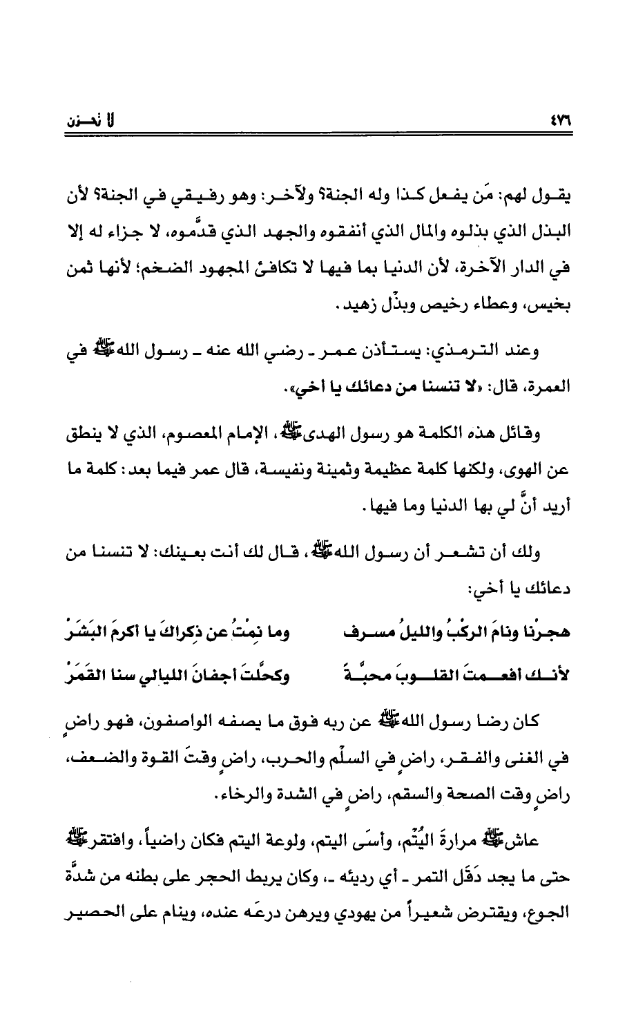 وعند الترمذيِّ: يستأذنُ عمرُ -رضي اللهُ عنه - رسول اللهِ - صلى الله عليه وسلم - في العمرةِ، قال: ((لا تنسنا من دعائِك يا أخي)) .