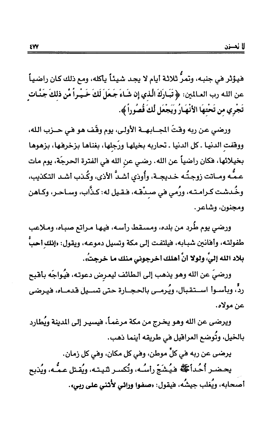 فيؤثرُ في جنبِه، وتمرُّ ثلاثةُ أيام لا يجدُ شيئاً يأكلُه، ومع ذلك كان راضياً عن اللهِ ربِّ العالمين {تَبَارَكَ الَّذِي إِن شَاء جَعَلَ لَكَ خَيْراً مِّن ذَلِكَ جَنَّاتٍ تَجْرِي مِن تَحْتِهَا الْأَنْهَارُ وَيَجْعَل لَّكَ قُصُوراً} .