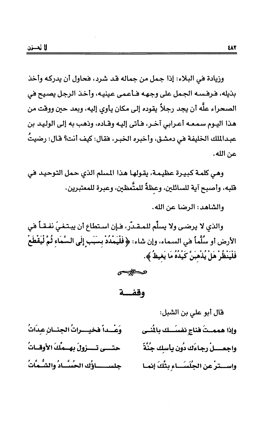 وزيادةً في البلاء: إذا جملٌ منْ جمالِهْ قْد شرد، فحاول أنْ يدركه وأخذ بذيِله علَّة أن يجد رجلاً يقودُه إلى مكان يأوي إليه، وبعد حينٍ ووقتٍ من هذا اليوم سمعه أعرابيُّ آخرُ، فأتى إليه وقاده، وذهب به إلى الوليدِ بنِ عبدِالملك الخليفةِ في دمشق، وأخبره الخَبَرَ، فقالَ: كيف أنتَ؟ قال: رضيتُ عن اللهِ.