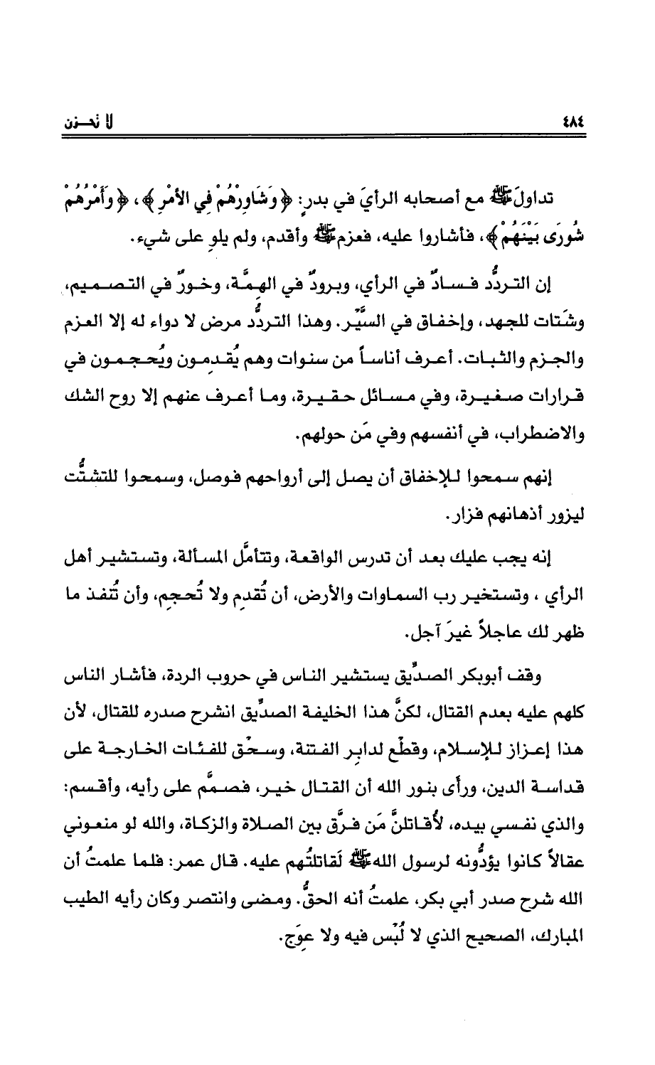 وقف أبو بكر الصدِّيق يستشيرُ الناس في حروبِ الردةِ، فأشار الناسُ كلهم عليه بعدمِ القتالِ، لكنَّ هذا الخليفة الصدِّيق انشرح صدرُه للقتالِ، لأن هذا إعزازٌ للإسلامِ، وقطْعٌ لدابر الفتنةِ، وسحقٌ للفئاتِ الخارجةِ على قداسةِ الدينِ، ورأى بنورِ اللهِ أن القتال خيرٌ، فصمَّم على رأيه، وأقسم: والذي نفسي بيدهِ، لأُقاتلنَّ من فرَّق بين الصلاةِ والزكاةِ، والله لو منعوني عقالاً كانوا يؤدُّونه لرسولِ الله - صلى الله عليه وسلم - لقاتلتُهم عليه. قال عمر: فلما علمتُ أن الله شرح صدر أبي بكر، علمتُ أنه الحقُّ. ومضى وانتصر وكان رأيهُ الطيب المبارك، الصحيح الذي لا لُبْس فيه ولا عِوَجَ.