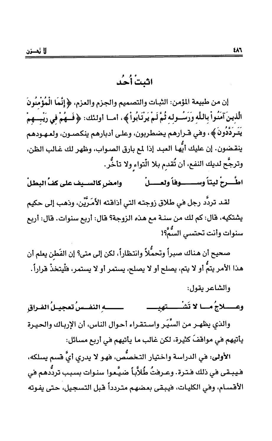 إنَّ منْ طبيعِة المؤمنِ: الثبات والتصميم والجزم والعزم، {إِنَّمَا الْمُؤْمِنُونَ الَّذِينَ آمَنُوا بِاللَّهِ وَرَسُولِهِ ثُمَّ لَمْ يَرْتَابُوا} ، أما أولئك: {فَهُمْ فِي رَيْبِهِمْ يَتَرَدَّدُونَ} ، وفي قرارِهم يضطربون، وعلى أدبارِهم ينكصون، ولعهودِهم ينقضون. إن عليك أيُّها العبدُ إذا لمع بارقُ الصوابِ، وظهر لك غالبُ الظنِّ، وترجَّح لديك النفعُ، أن تُقدِم بلا التواءٍ ولا تأخُّرٍ.